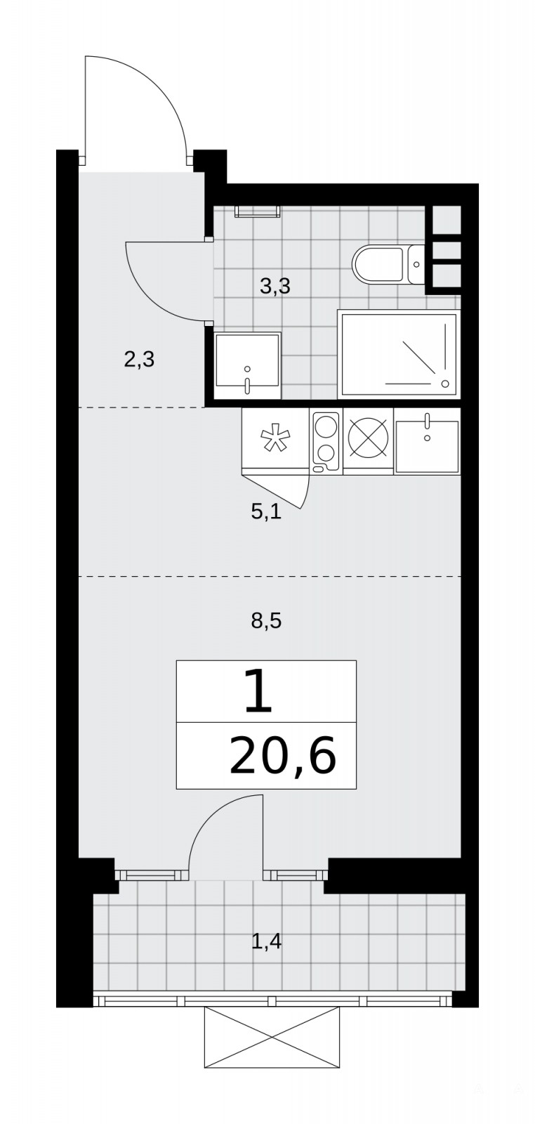Просторная 1-комн. квартира-студия в ЖК "Деснаречье" на 6 этаже. Квартира без отделки, полностью готова к чистовой отделке и дальнейшему ремонту. Общая площадь: 20.6 кв.м., площадь гостиной 13.6 кв.м., из которых 5.1 кв.м. выделено под кухонную зону. Все окна выходят на одну сторону. В квартире один балкон, один совмещенный санузел. Высота потолков 2.99 м.