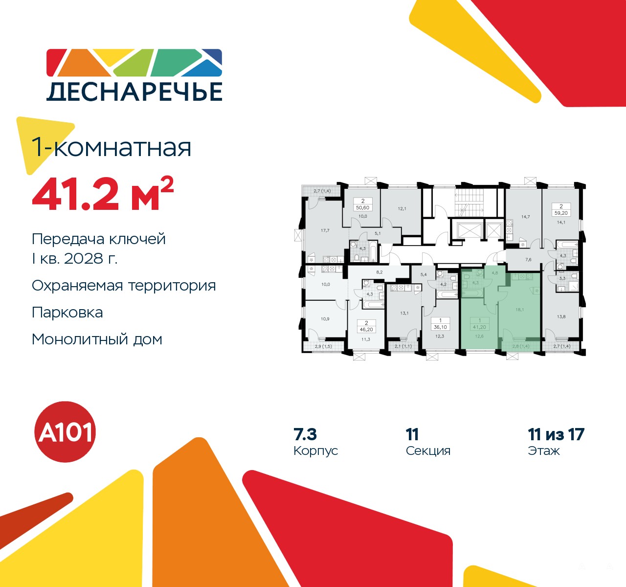 Дом монолитный, черырехподъездный, переменной этажности, от 9 до 17 этажей. Квартира находится в 1-й секции высотой 15 этажей в корпусе 7.3. На этаже 5 квартир. В подъезде 1 пассажирский и 1 грузовой лифт. Начало строительства - 2 квартал 2025 года. Окончание строительства - 1 квартал 2028 года. Оформление сделки по договору долевого участия.