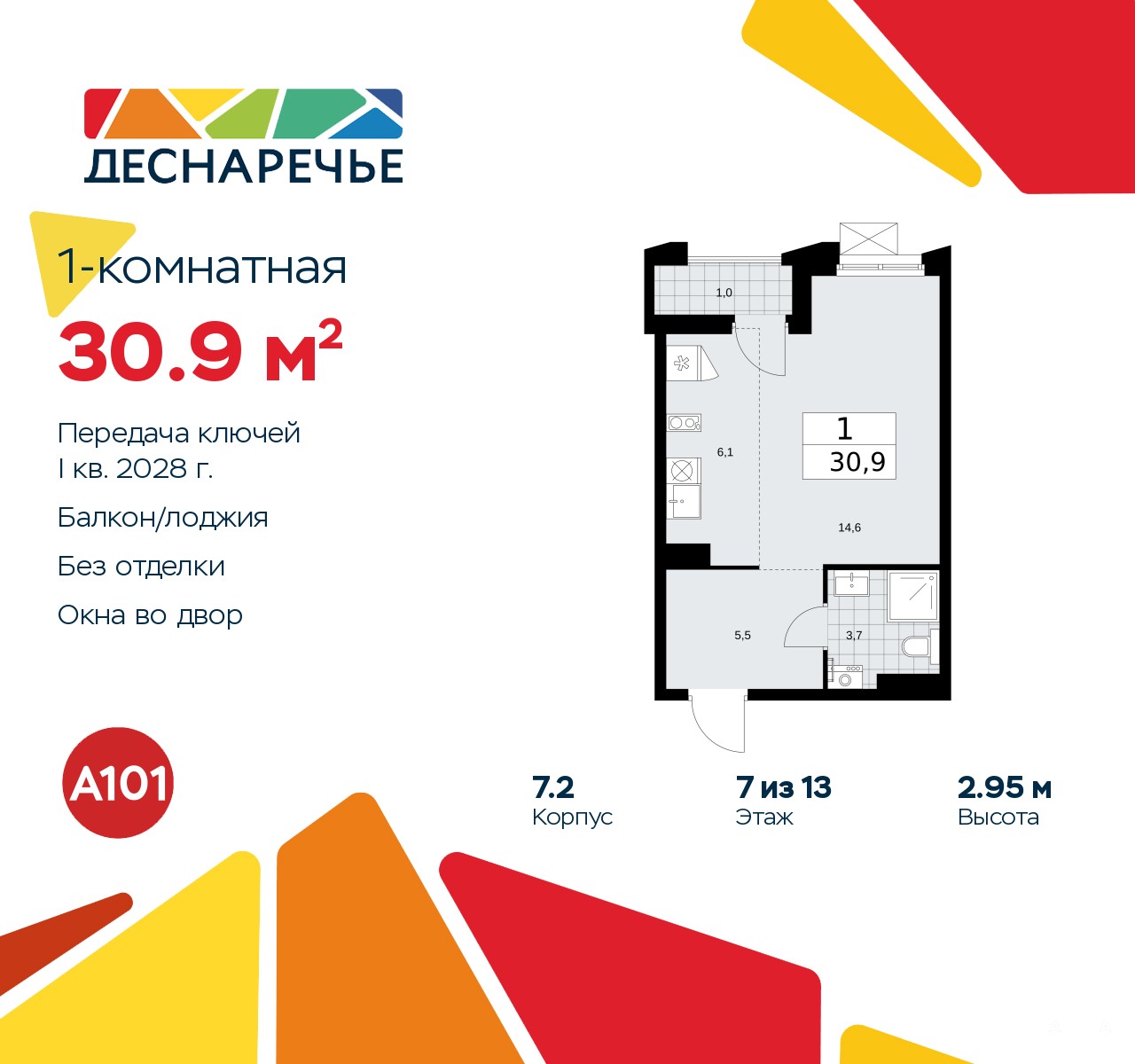 Однокомнатная квартира-студия в ЖК "Деснаречье" на 7 этаже. Квартира без отделки, после оформления собственности можно делать ремонт. Общая площадь: 30.9 кв.м., площадь гостиной 20.7 кв.м., из которых 6.1 кв.м. выделено под кухонную зону. Все окна выходят на одну сторону. В квартире одна лоджия, один совмещенный санузел. Высота потолков 2.95 м.