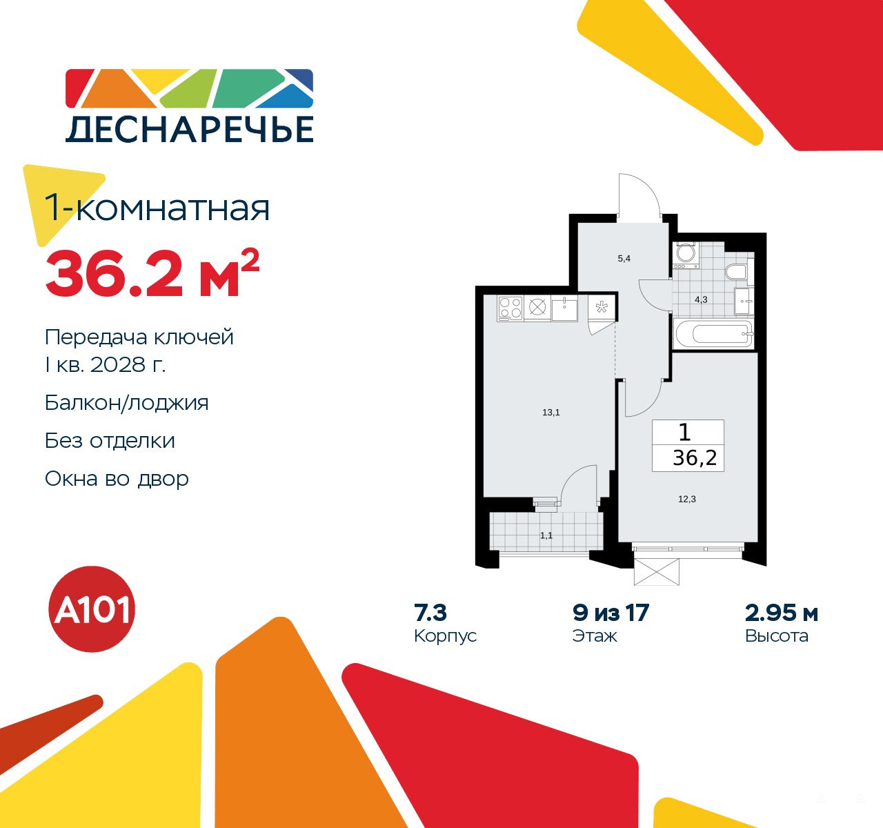 1-комн. квартира в ЖК "Деснаречье" на 9 этаже. Квартира без отделки, после выдачи ключей можно делать ремонт. Общая площадь: 36.2 кв.м., жилая: 12.3 кв.м., площадь просторной кухни-столовой: 13.1 кв.м. Все окна выходят на одну сторону. В квартире одна лоджия, один совмещенный санузел. Высота потолков 2.95 м.