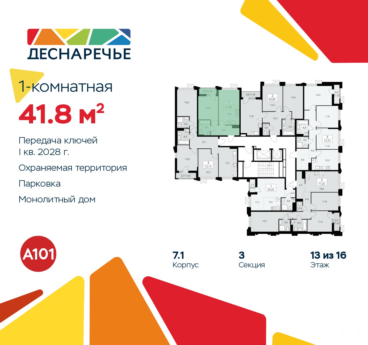 Дом монолитный, многоподъездный, переменной этажности, от 8 до 16 этажей. Квартира находится в 3-й секции высотой 14 этажей в корпусе 7.1. На этаже 6 квартир. В подъезде 1 пассажирский и 1 грузовой лифт. Начало строительства - 2 квартал 2025 года. Окончание строительства - 1 квартал 2028 года. Оформление сделки по договору долевого участия.