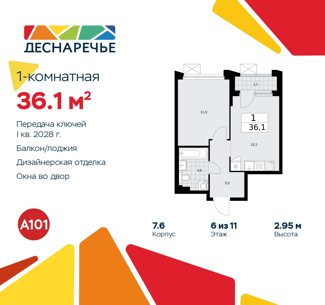 1-комн. квартира с отделкой в ЖК "Деснаречье" на 6 этаже. Общая площадь: 36.1 кв.м., жилая: 11.9 кв.м., площадь просторной кухни-столовой: 13.1 кв.м. Все окна выходят на одну сторону. В квартире одна лоджия, один совмещенный санузел. Высота потолков 2.95 м.