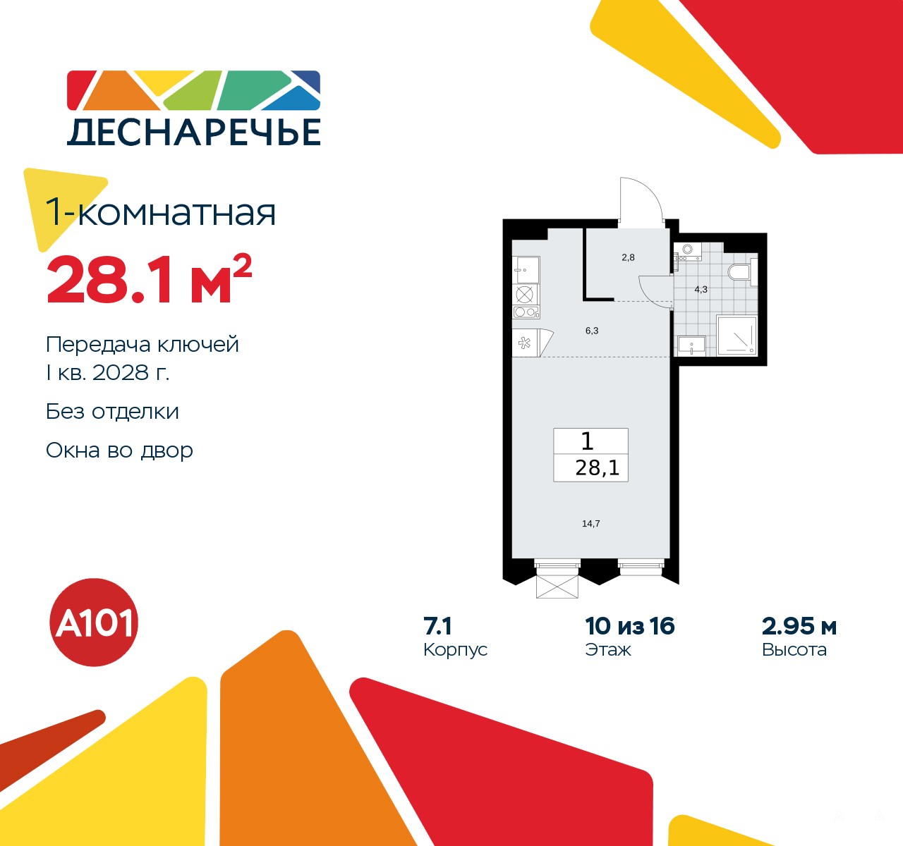 Просторная 1-комн. квартира-студия в ЖК "Деснаречье" на 10 этаже. Квартира без отделки, полностью готова к чистовой отделке и дальнейшему ремонту. Общая площадь: 28.1 кв.м., площадь гостиной 21 кв.м., из которых 6.3 кв.м. выделено под кухонную зону. Все окна выходят на одну сторону. В квартире один совмещенный санузел. Высота потолков 2.95 м.