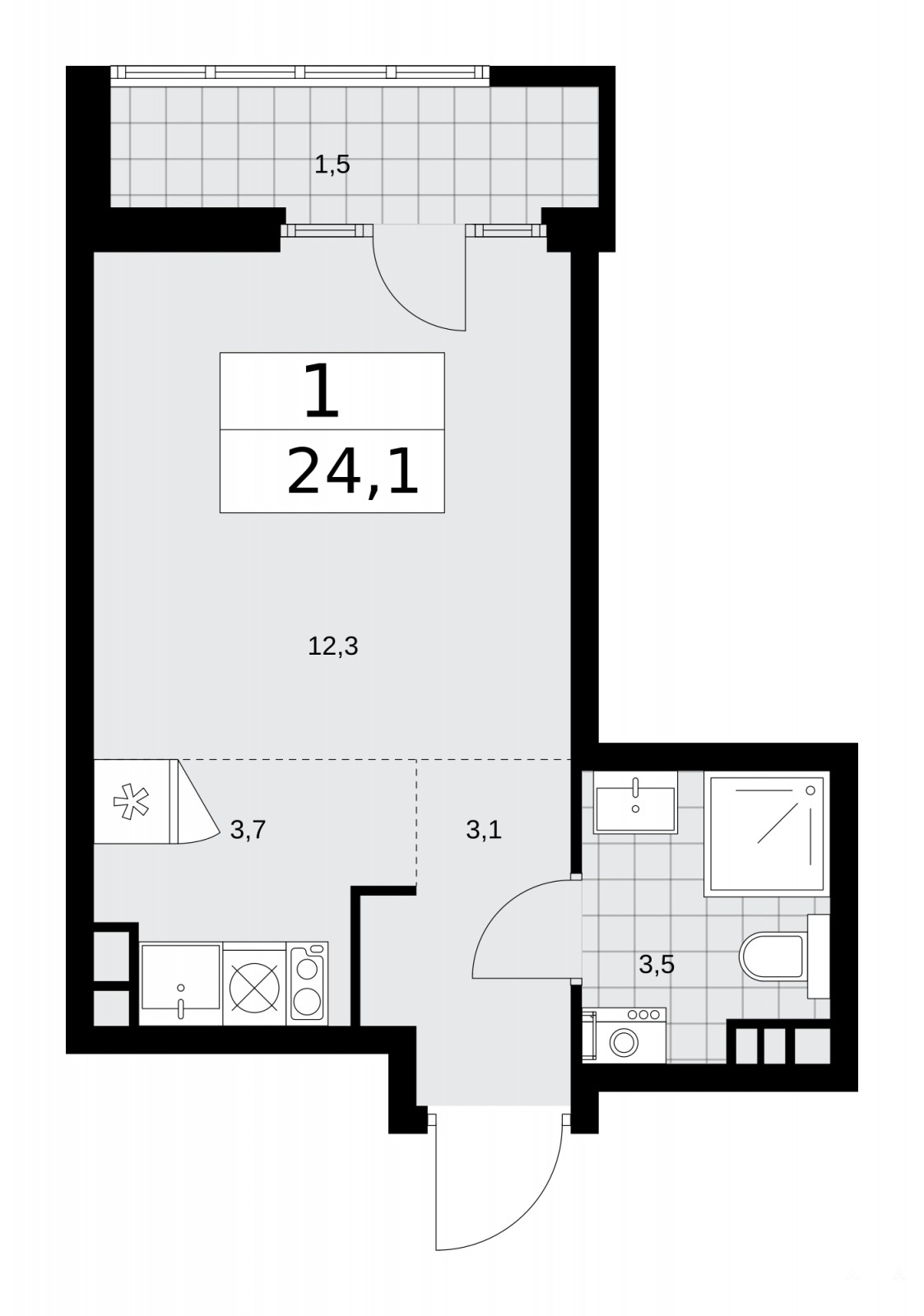 Однокомнатная квартира-студия в ЖК "Деснаречье" на 3 этаже. Квартира без отделки, полностью готова к ремонту. Общая площадь: 24.1 кв.м., площадь гостиной 16 кв.м., из которых 3.7 кв.м. выделено под кухонную зону. Все окна выходят на одну сторону. В квартире один балкон, один совмещенный санузел. Высота потолков 2.99 м.
