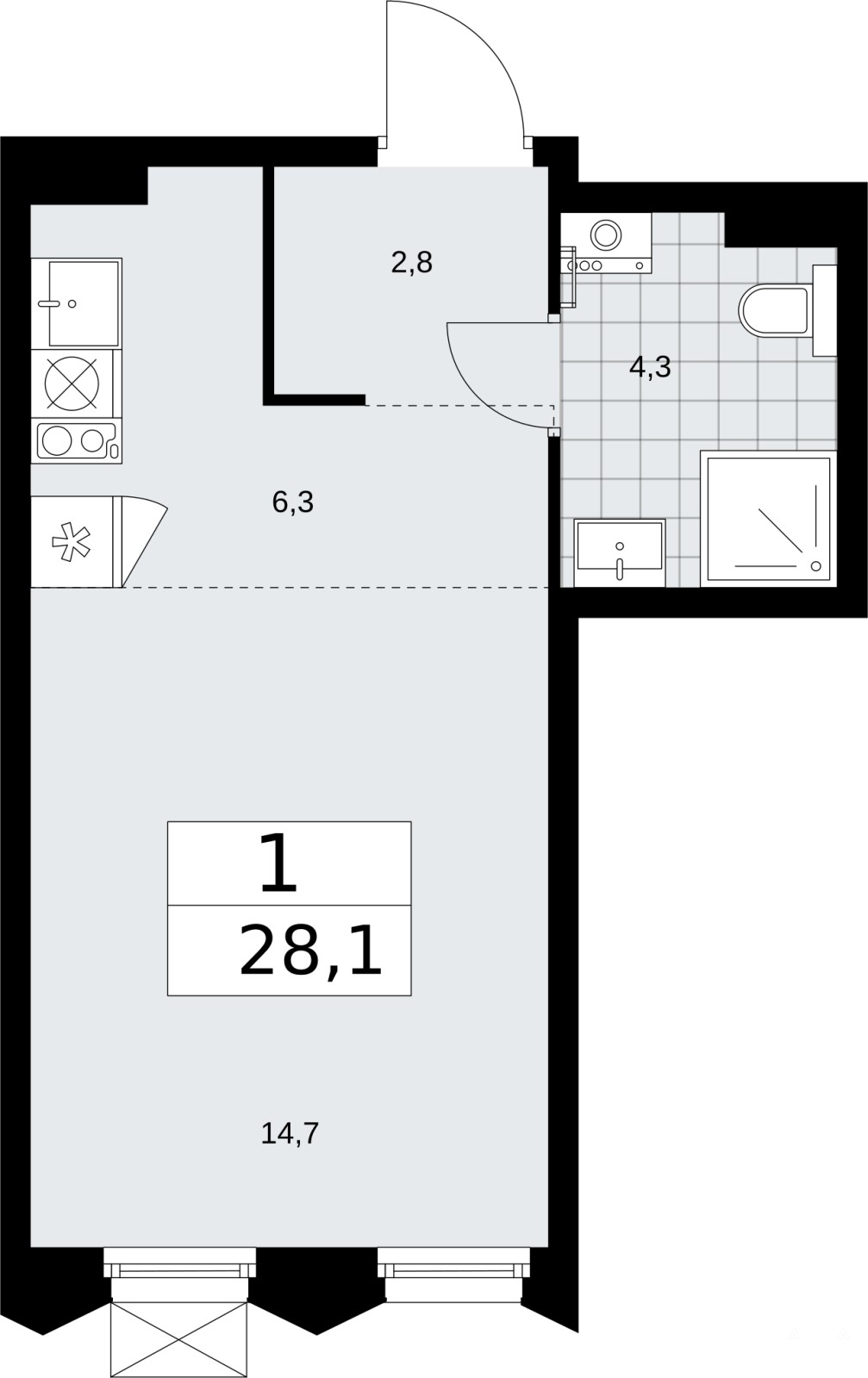 1-комн. квартира-студия в ЖК "Деснаречье" на 10 этаже. Квартира без отделки, полностью готова к чистовой отделке и дальнейшему ремонту. Общая площадь: 28.1 кв.м., площадь гостиной 21 кв.м., из которых 6.3 кв.м. выделено под кухонную зону. Все окна выходят на одну сторону. В квартире один совмещенный санузел. Высота потолков 2.95 м.