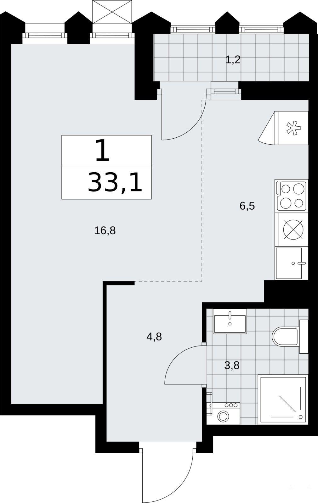 Однокомнатная квартира-студия от застройщика с отделкой в ЖК "Деснаречье" на 5 этаже. Общая площадь: 33.1 кв.м., площадь гостиной 23.3 кв.м., из которых 6.5 кв.м. выделено под кухонную зону. Все окна выходят на одну сторону. В квартире одна лоджия, один совмещенный санузел. Высота потолков 2.95 м.