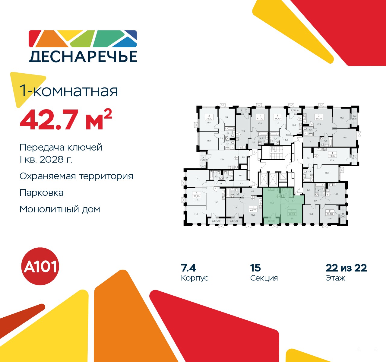 Квартира находится в корпусе 7.4. Дом монолитный, одноподъездный, высотой 22 этажа. На этаже 9 квартир. В подъезде 1 пассажирский и 2 грузовых лифта. Начало строительства - 2 квартал 2025 года. Окончание строительства - 1 квартал 2028 года. Оформление сделки по договору долевого участия.