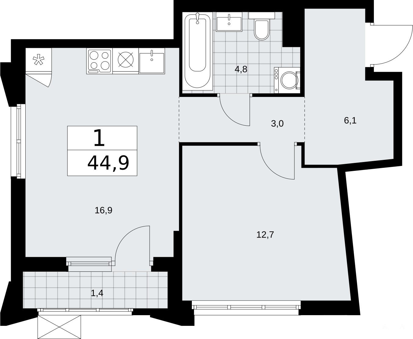 Продается однокомнатная квартира в ЖК "Деснаречье" на 8 этаже. Квартира без отделки, полностью готова к ремонту. Общая площадь: 44.9 кв.м., жилая: 12.7 кв.м., площадь просторной кухни-столовой: 16.9 кв.м. Угловая квартира, идеально подойдет любителям тишины и панорамных видов. В квартире одна лоджия, один совмещенный санузел. Высота потолков 2.95 м.