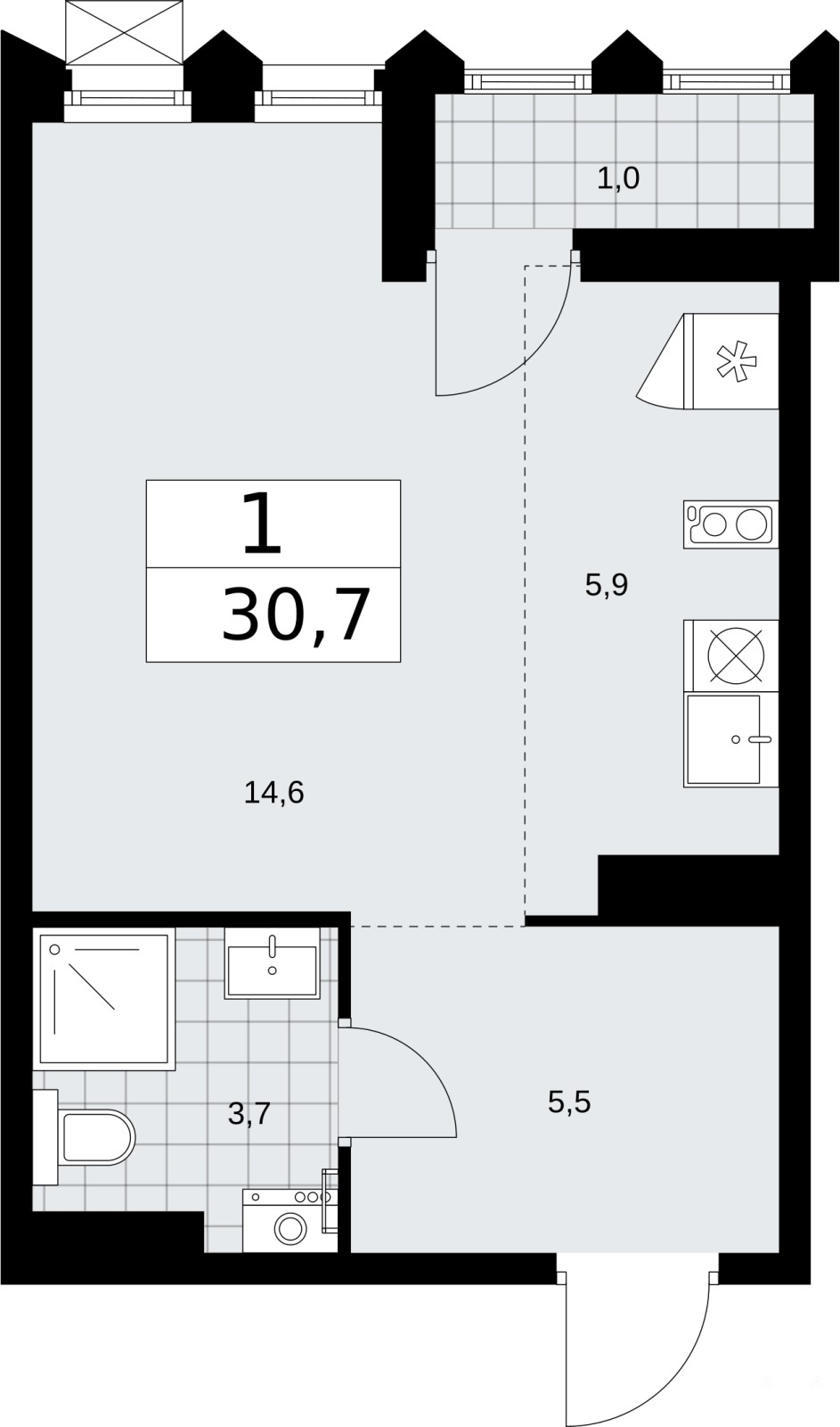 Просторная 1-комн. квартира-студия в ЖК "Деснаречье" на 13 этаже. Квартира без отделки, после оформления собственности можно делать ремонт. Общая площадь: 30.7 кв.м., площадь гостиной 20.5 кв.м., из которых 5.9 кв.м. выделено под кухонную зону. Все окна выходят на одну сторону. В квартире одна лоджия, один совмещенный санузел. Высота потолков 2.95 м.