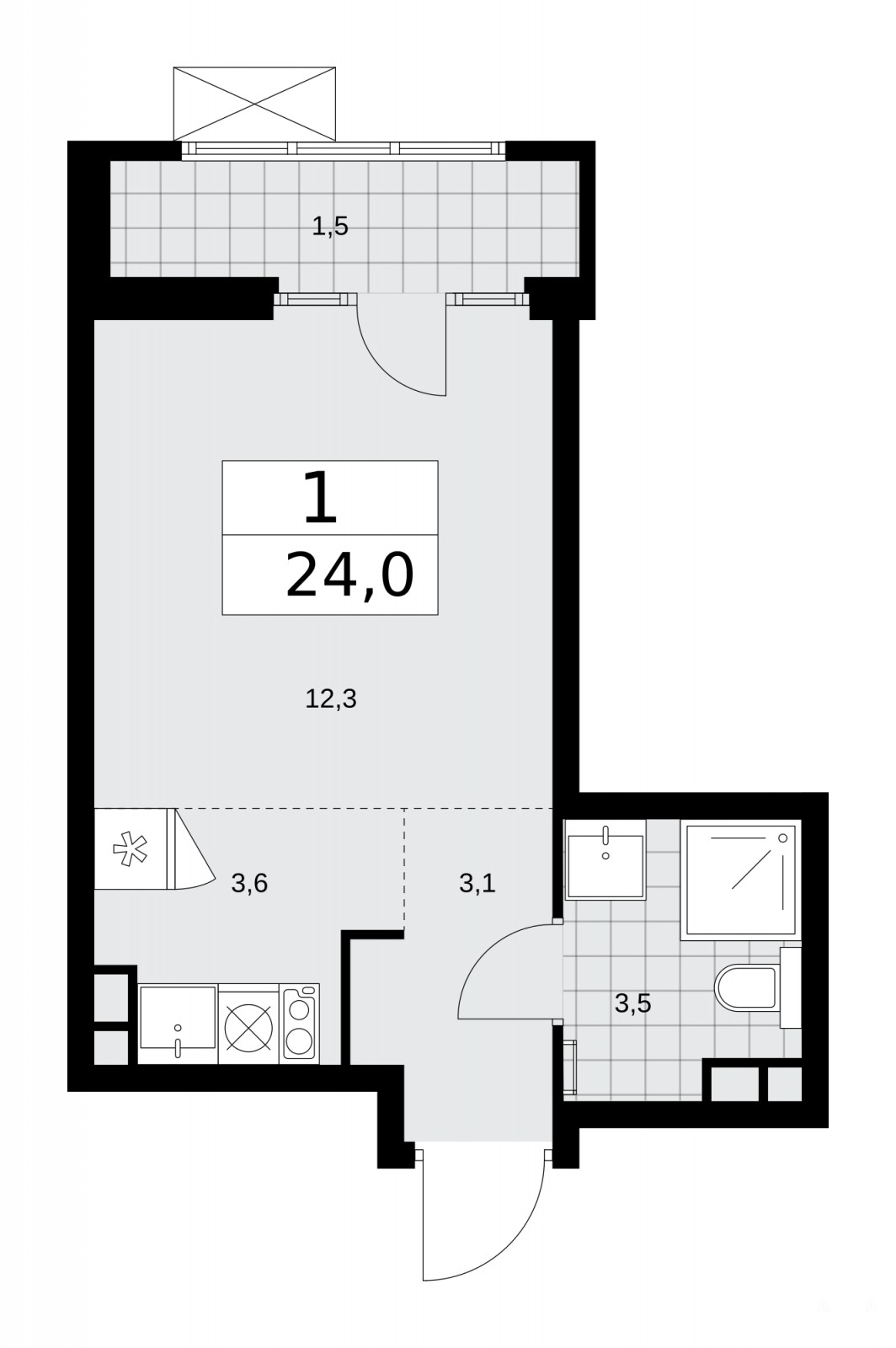 1-комн. квартира-студия в ЖК "Деснаречье" на 4 этаже. Квартира без отделки, после получения ключей можно делать ремонт. Общая площадь: 24 кв.м., площадь гостиной 15.9 кв.м., из которых 3.6 кв.м. выделено под кухонную зону. Все окна выходят на одну сторону. В квартире один балкон, один совмещенный санузел. Высота потолков 2.99 м.