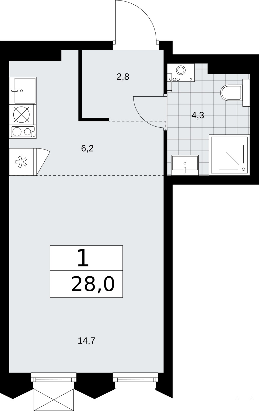Просторная 1-комн. квартира-студия в ЖК "Деснаречье" на 11 этаже. Квартира без отделки, полностью готова к ремонту. Общая площадь: 28 кв.м., площадь гостиной 20.9 кв.м., из которых 6.2 кв.м. выделено под кухонную зону. Все окна выходят на одну сторону. В квартире один совмещенный санузел. Высота потолков 2.95 м.