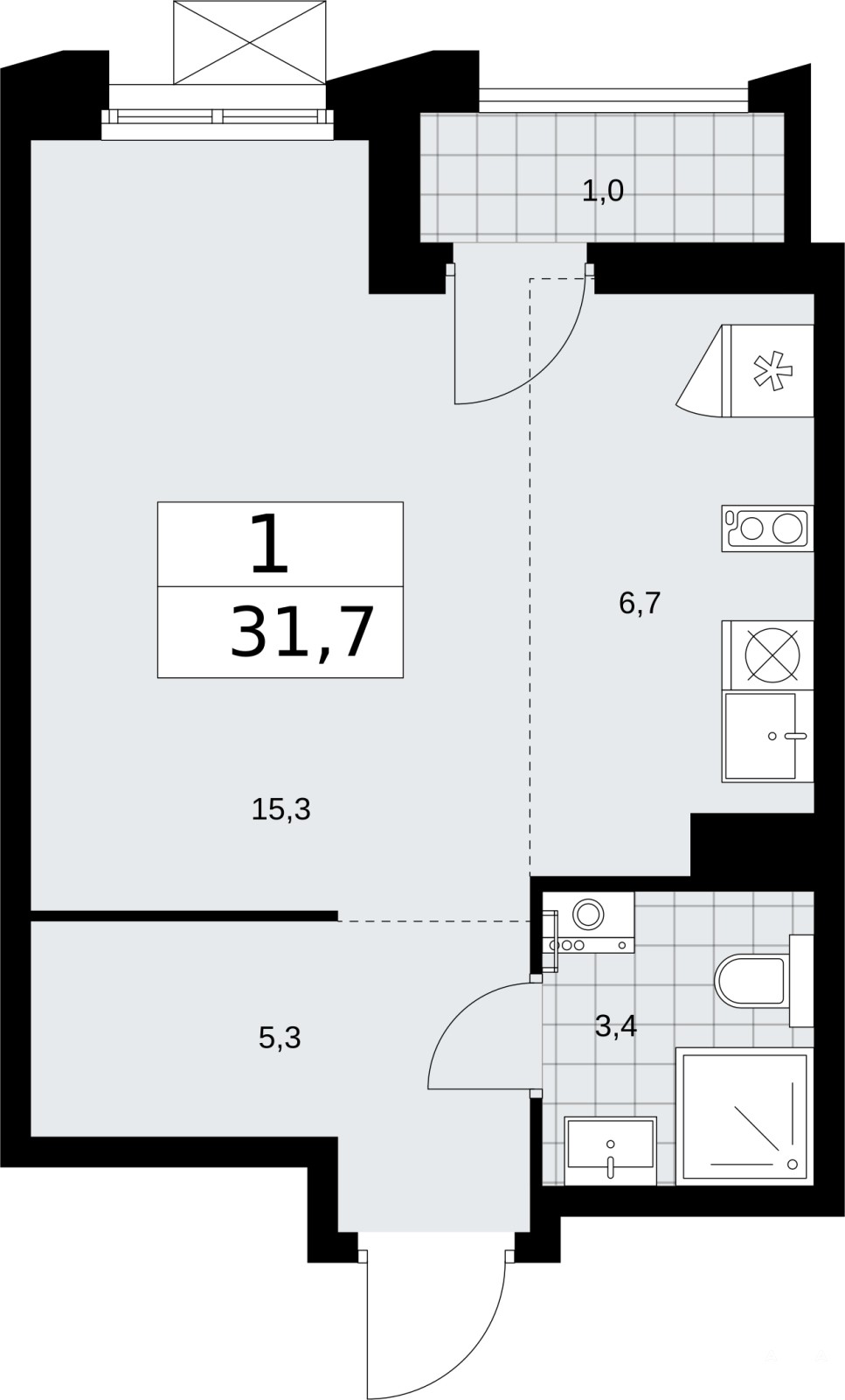 Просторная 1-комн. квартира-студия в ЖК "Деснаречье" на 9 этаже. Квартира без отделки, полностью готова к ремонту. Общая площадь: 31.7 кв.м., площадь гостиной 22 кв.м., из которых 6.7 кв.м. выделено под кухонную зону. Все окна выходят на одну сторону. В квартире одна лоджия, один совмещенный санузел. Высота потолков 2.95 м.