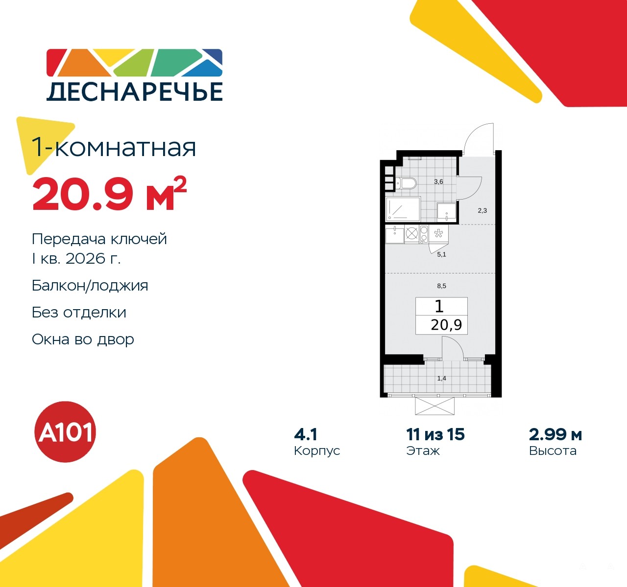 Однокомнатная квартира-студия в ЖК "Деснаречье" на 11 этаже. Квартира без отделки, новый собственник может сделать ремонт по своему проекту. Общая площадь: 20.9 кв.м., площадь гостиной 13.6 кв.м., из которых 5.1 кв.м. выделено под кухонную зону. Все окна выходят на одну сторону. В квартире один балкон, один совмещенный санузел. Высота потолков 2.99 м.