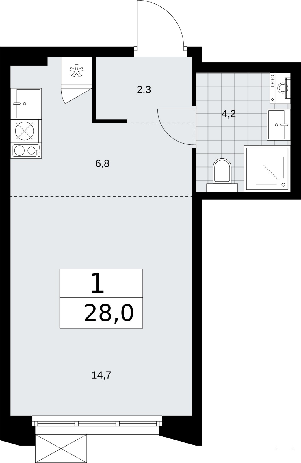 1-комн. квартира-студия от застройщика в ЖК "Деснаречье" на 3 этаже. Квартира без отделки, новый владелец может сделать ремонт по индивидуальному проекту. Общая площадь: 28 кв.м., площадь гостиной 20.9 кв.м., из которых 6.2 кв.м. выделено под кухонную зону. Все окна выходят на одну сторону. В квартире один совмещенный санузел. Высота потолков 2.95 м.