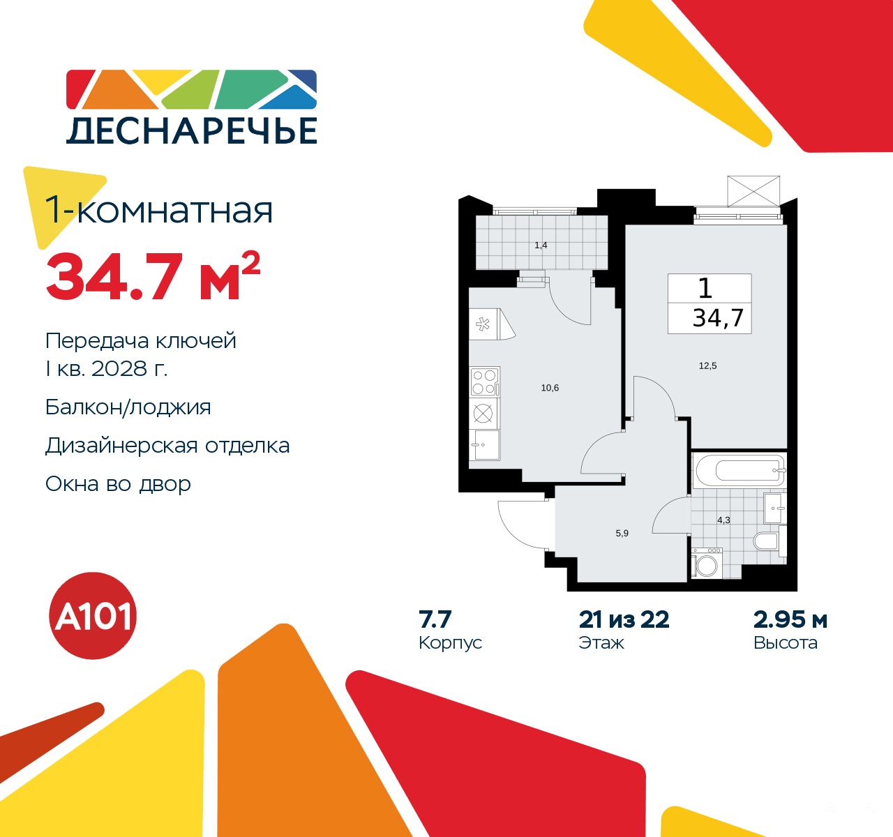 1-комн. квартира от застройщика с отделкой в ЖК "Деснаречье" на 21 этаже. Общая площадь: 34.7 кв.м., жилая: 12.5 кв.м., площадь просторной кухни-столовой: 10.6 кв.м. Все окна выходят на одну сторону. В квартире одна лоджия, один совмещенный санузел. Высота потолков 2.95 м.