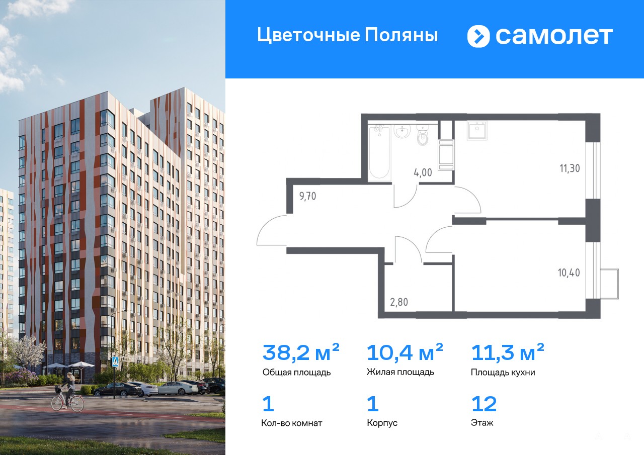 Строим кварталы для жизни с заботой о будущем. Предлагается 1-комнатная квартира комфорт-класса 38, 2 кв.м в корпусе 1 на 12 этаже, в ЖК «Цветочные Поляны»