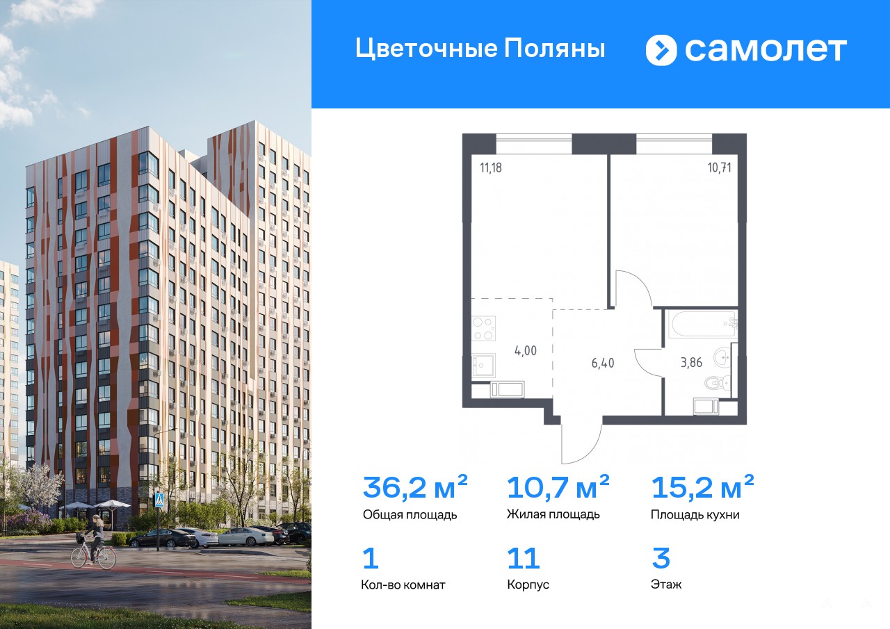 Строим кварталы для жизни с заботой о будущем. Предлагается 1-комнатная квартира комфорт-класса 36, 15 кв.м в корпусе 11 на 3 этаже, в ЖК «Цветочные Поляны»