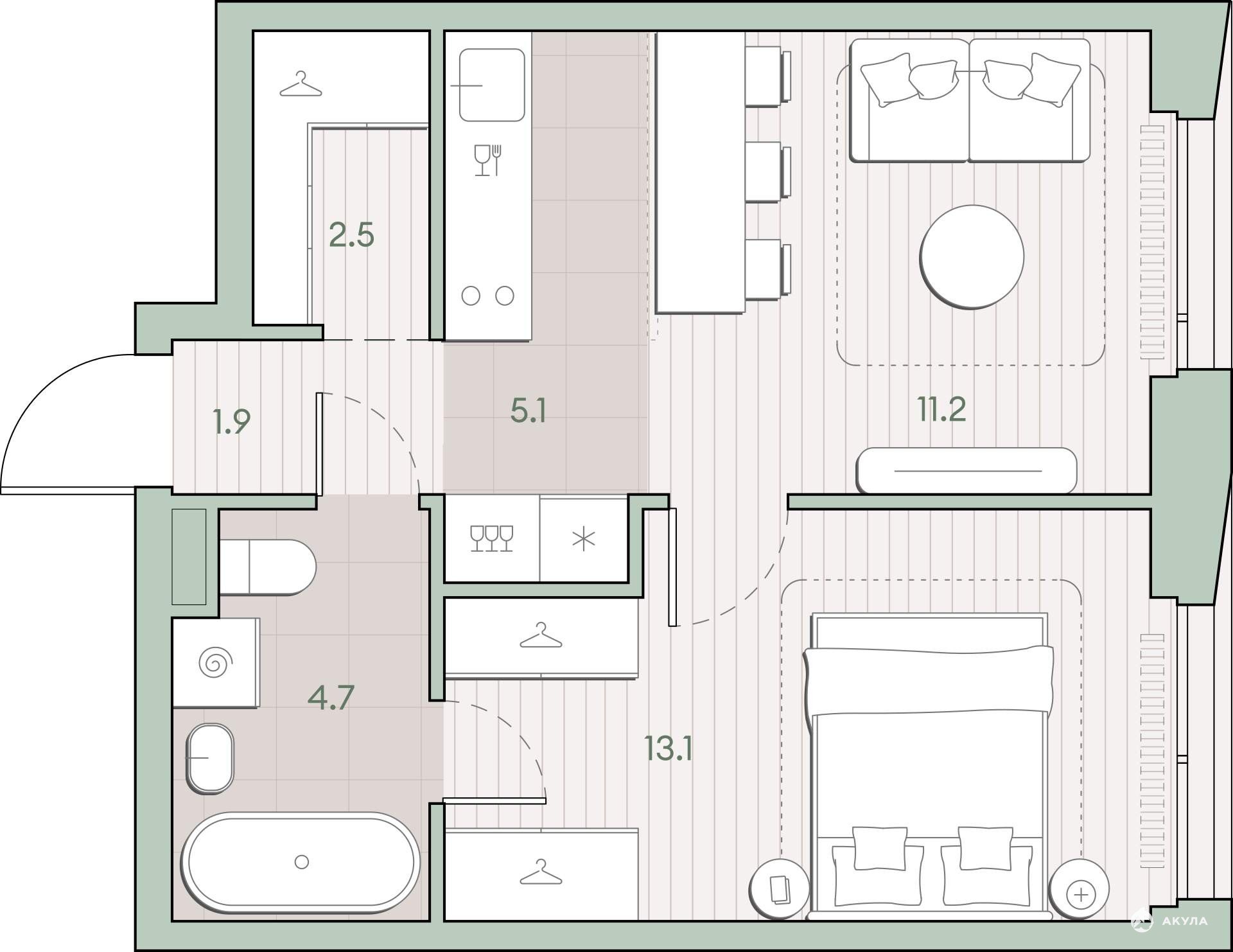 Жилая площадь 24.3 м2, кухня 5.1 м2, квартира без отделки, комнаты изолированные.