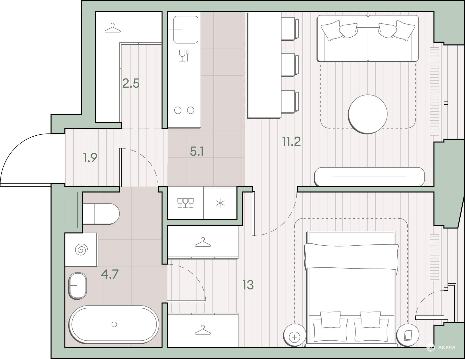 Жилая площадь 24.2 м2, кухня 5.1 м2, квартира без отделки, комнаты изолированные.