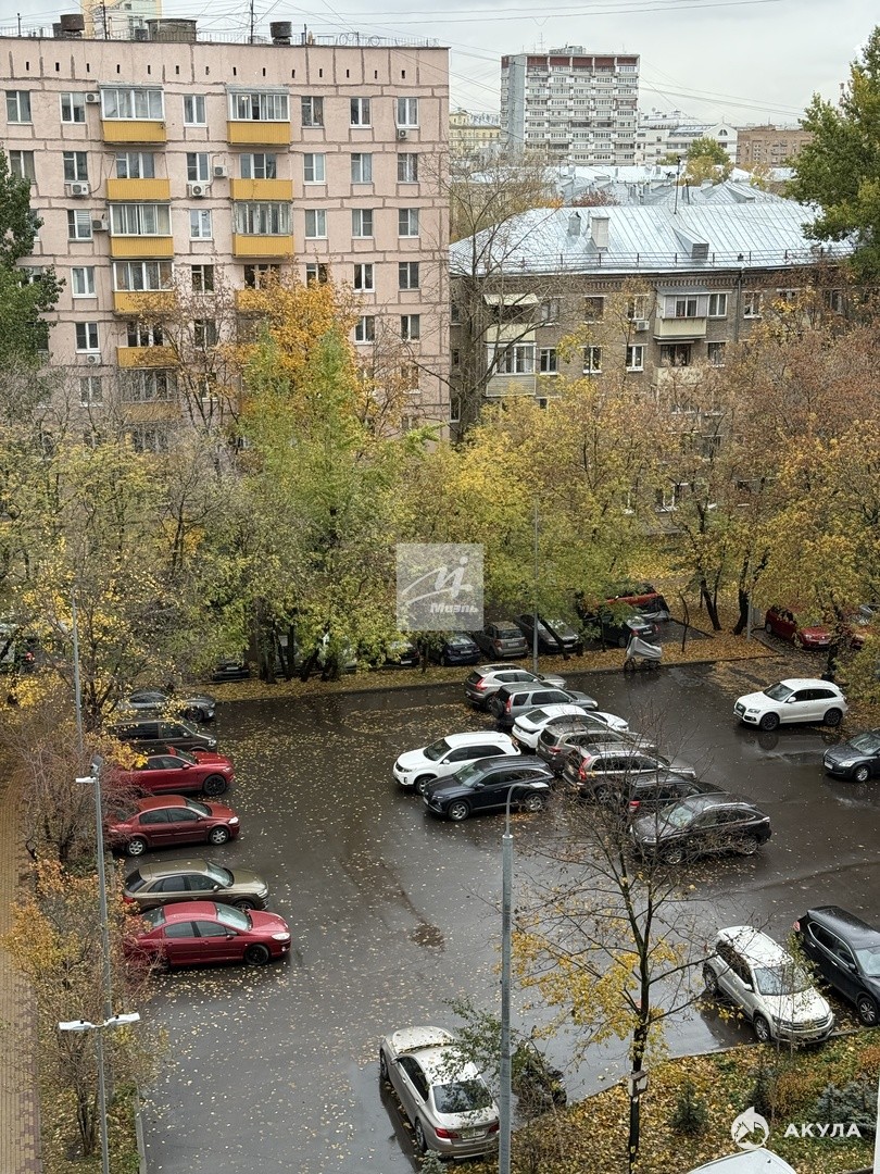 Окна выходят во двор, на домовую, закрытую шлагбаумом, стоянку машин, вдали от проезжей части.