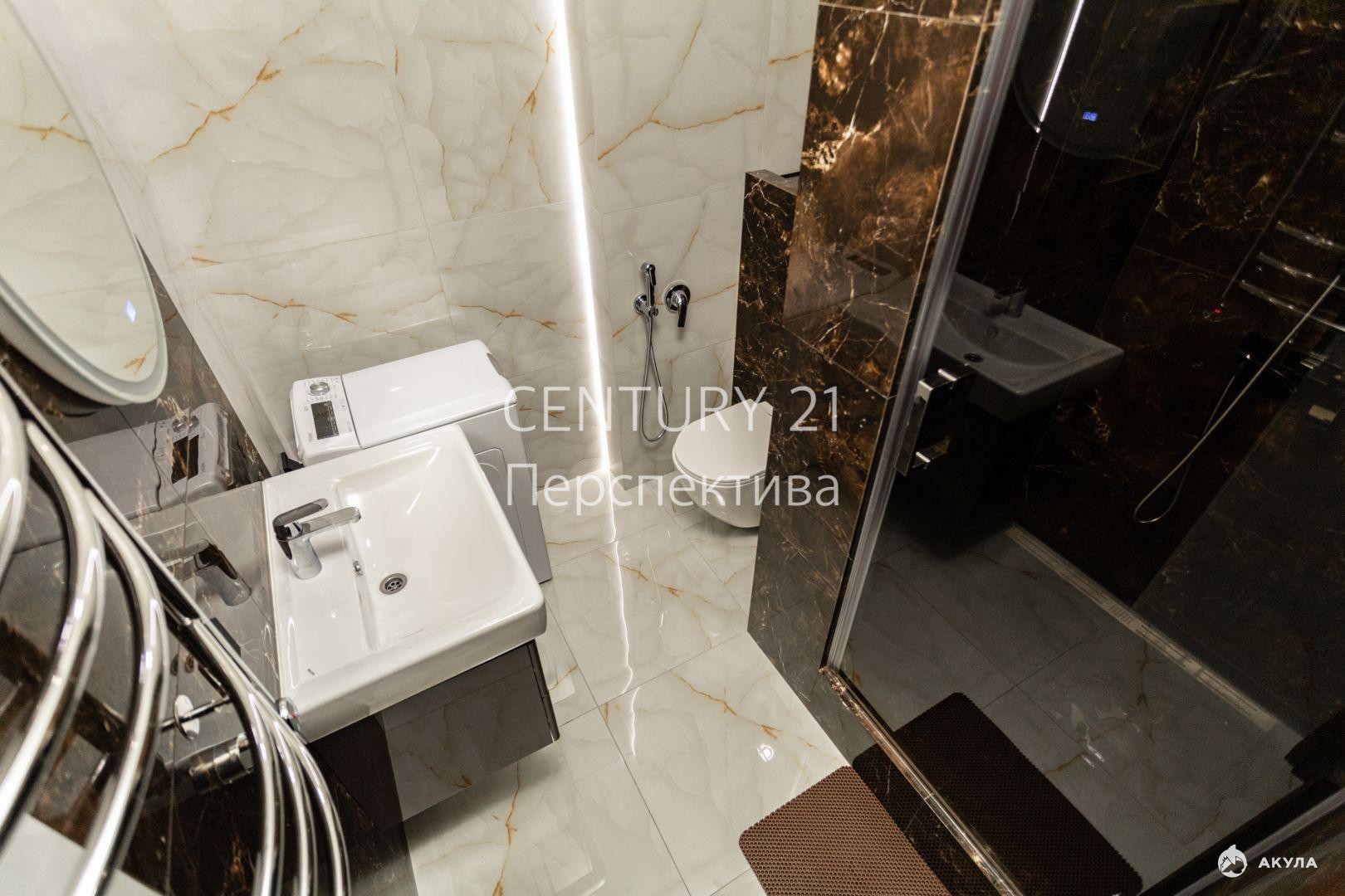 -Совмещенный санузел со встроенной душевой кабиной и подсветкой, есть место для установки встроенного шкафа, теневые потолки;