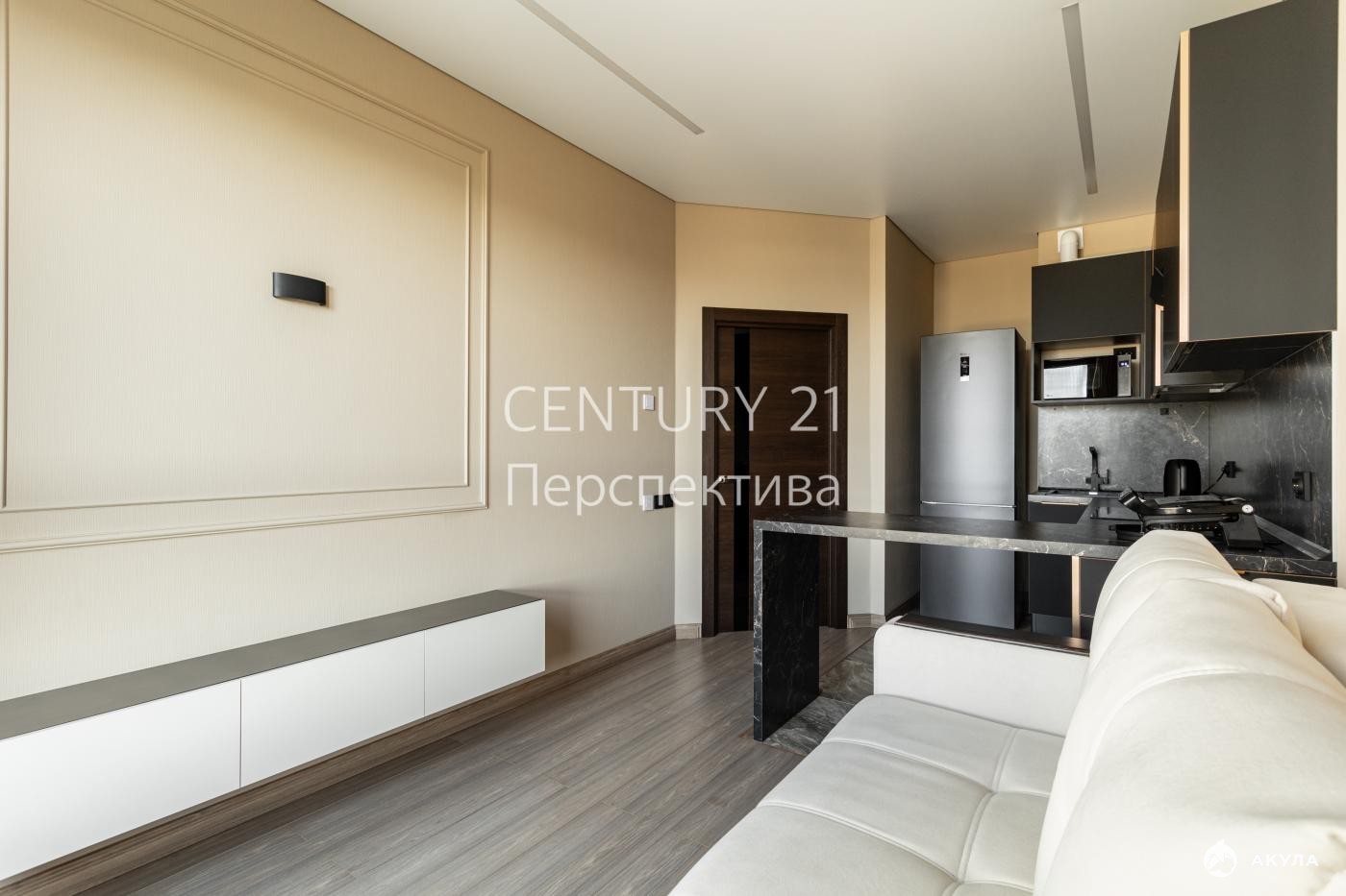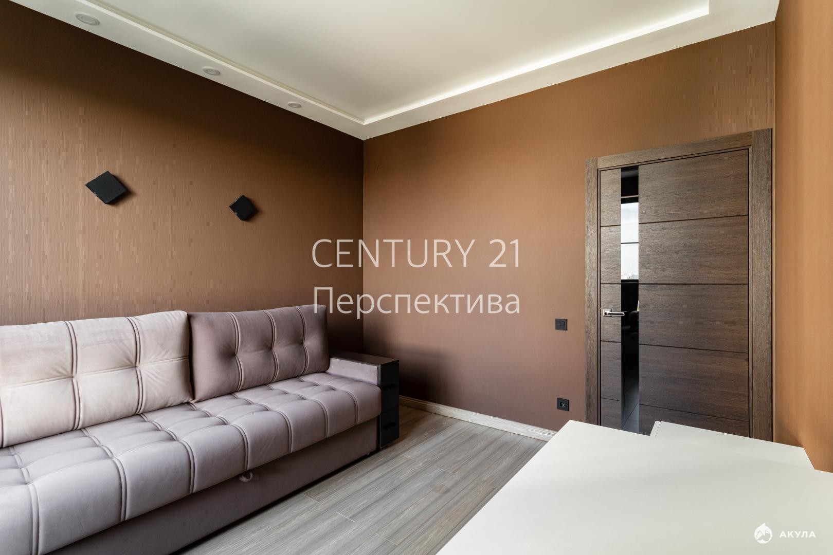 -В гостиной просторный встроенный шкаф, теневые потолки;