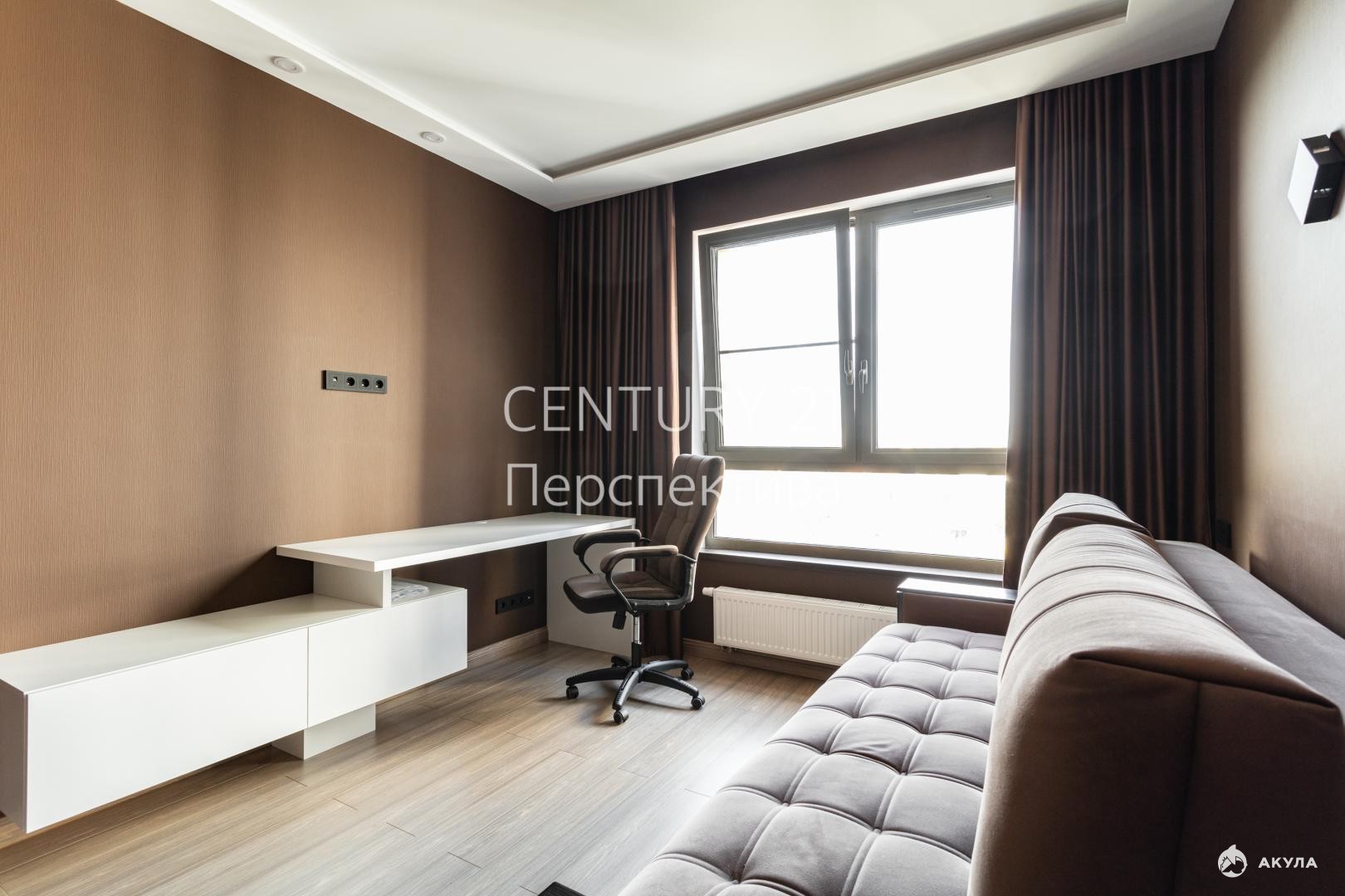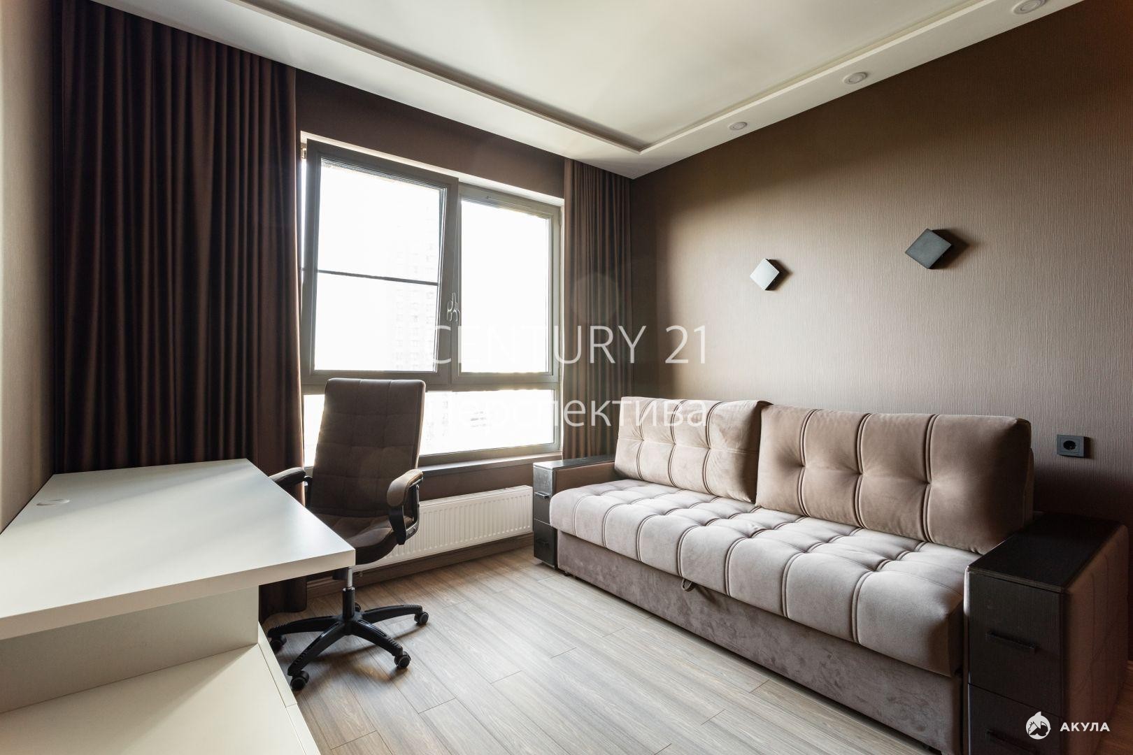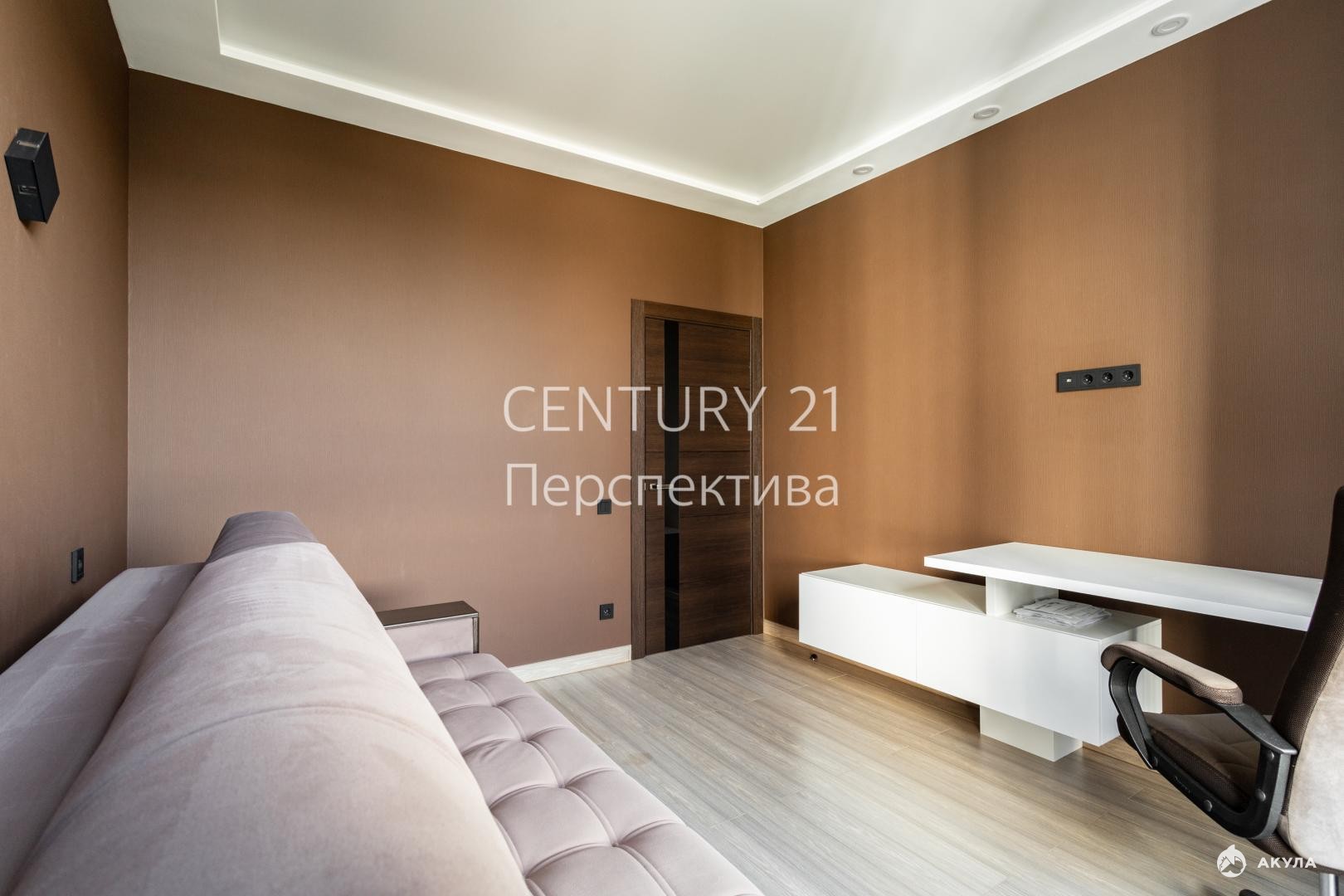 -Спальня с выделенным местом под шкаф, диваном, дизайнерским столом с тумбой, подсветкой потолка, шумоизоляцией стен;