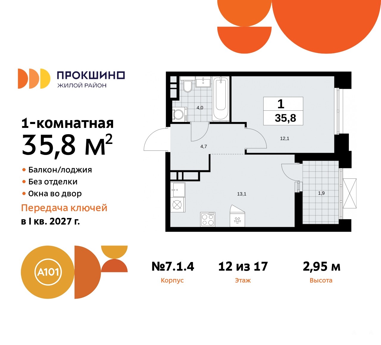 Однокомнатная квартира от застройщика в ЖК "Прокшино" на 12 этаже. Квартира без отделки, новый собственник может сделать ремонт по индивидуальному проекту. Общая площадь: 35.8 кв.м., жилая: 12.1 кв.м., площадь просторной кухни-столовой: 13.1 кв.м. Все окна выходят на одну сторону. В квартире одна лоджия, один совмещенный санузел. Высота потолков 2.95 м.