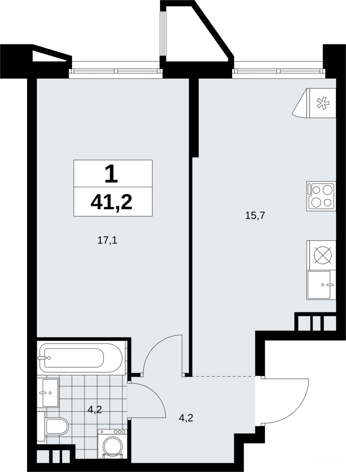 Однокомнатная квартира от застройщика с отделкой в ЖК "Прокшино" на 4 этаже. Общая площадь: 41.2 кв.м., жилая: 17.1 кв.м., площадь просторной кухни-столовой: 15.7 кв.м. Все окна выходят на одну сторону. В квартире один совмещенный санузел. Высота потолков 2.95 м.