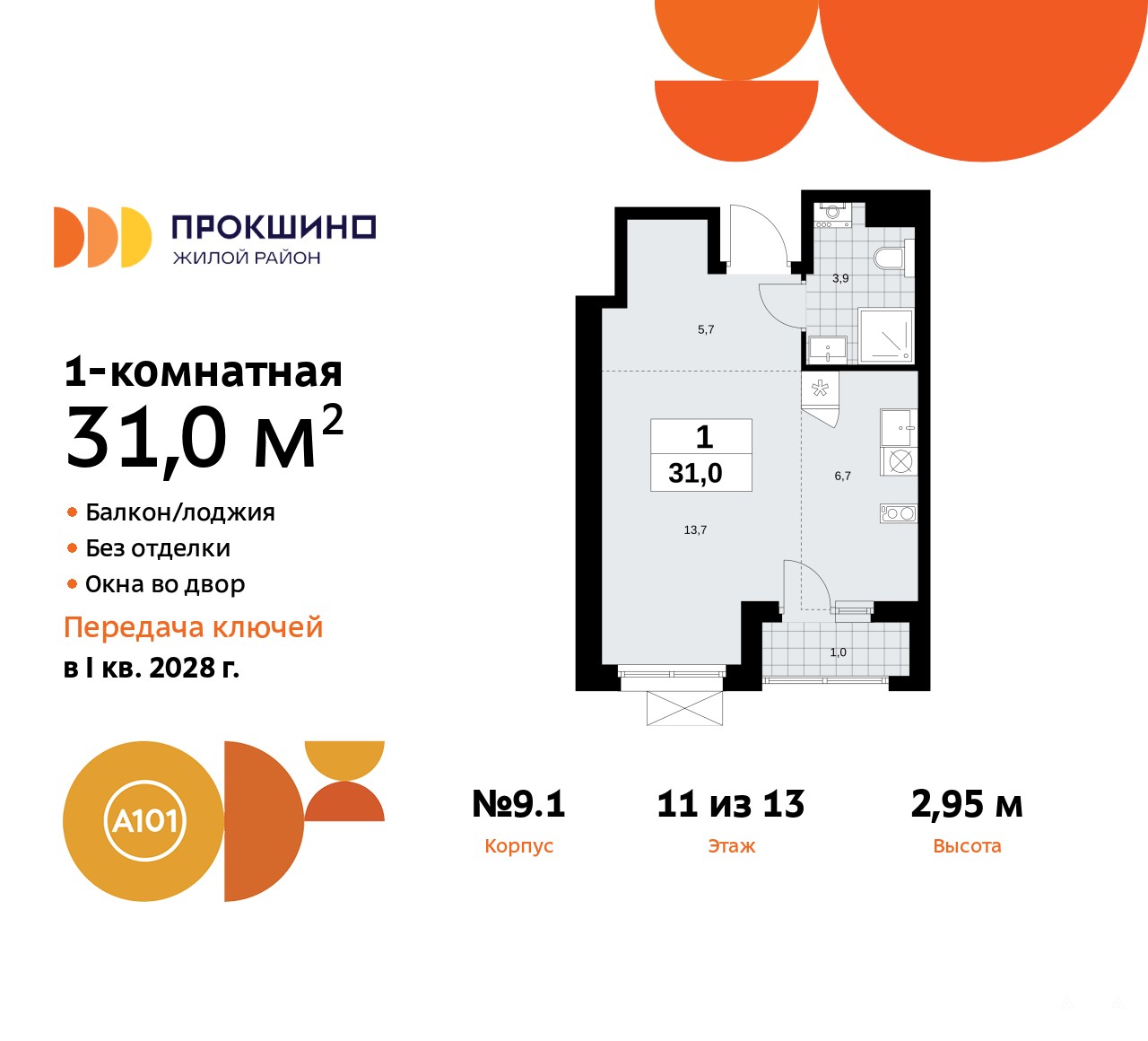1-комн. квартира-студия от застройщика в ЖК "Прокшино" на 11 этаже. Квартира без отделки, новый собственник может сделать ремонт по индивидуальному дизайн-проекту. Общая площадь: 31 кв.м., площадь гостиной 20.4 кв.м., из которых 6.7 кв.м. выделено под кухонную зону. Все окна выходят на одну сторону. В квартире одна лоджия, один совмещенный санузел. Высота потолков 2.95 м.