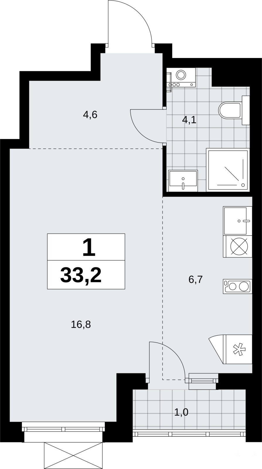 Однокомнатная квартира-студия в ЖК "Прокшино" на 8 этаже. Квартира без отделки, полностью готова к ремонту. Общая площадь: 33.2 кв.м., площадь гостиной 23.5 кв.м., из которых 6.7 кв.м. выделено под кухонную зону. Все окна выходят на одну сторону. В квартире одна лоджия, один совмещенный санузел. Высота потолков 2.95 м.
