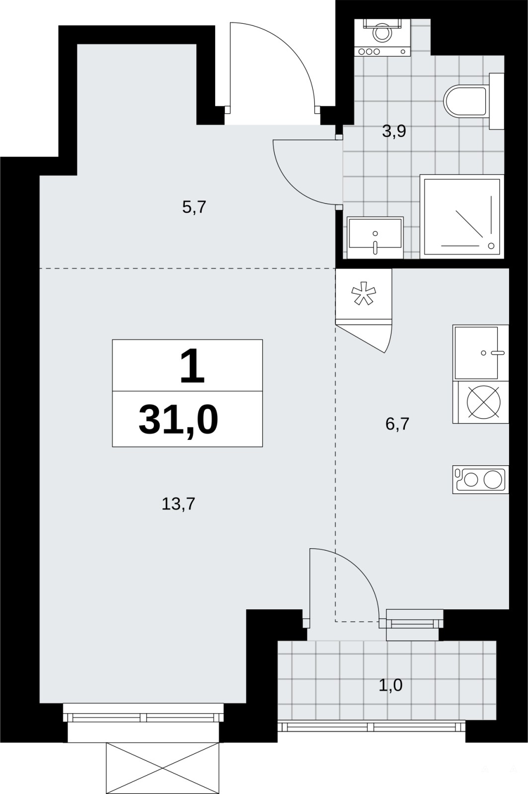 Продается 1-комн. квартира-студия от застройщика в ЖК "Прокшино" на 11 этаже. Квартира без отделки, после оформления собственности можно делать ремонт. Общая площадь: 31 кв.м., площадь гостиной 20.4 кв.м., из которых 6.7 кв.м. выделено под кухонную зону. Все окна выходят на одну сторону. В квартире одна лоджия, один совмещенный санузел. Высота потолков 2.95 м.