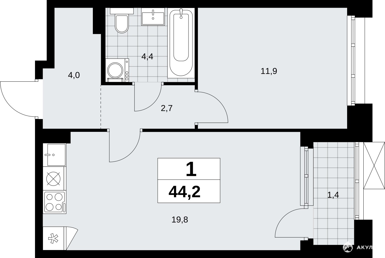 1-комн. квартира от застройщика с отделкой в ЖК "Прокшино" на 7 этаже. Общая площадь: 44.2 кв.м., жилая: 11.9 кв.м., площадь просторной кухни-столовой: 19.8 кв.м. Все окна выходят на одну сторону. В квартире одна лоджия, один совмещенный санузел. Высота потолков 2.95 м.