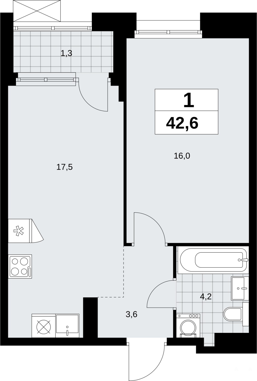 1-комн. квартира с отделкой в ЖК "Прокшино" на 15 этаже. Общая площадь: 42.6 кв.м., жилая: 16 кв.м., площадь просторной кухни-столовой: 17.5 кв.м. Все окна выходят на одну сторону. В квартире одна лоджия, один совмещенный санузел. Высота потолков 2.95 м.