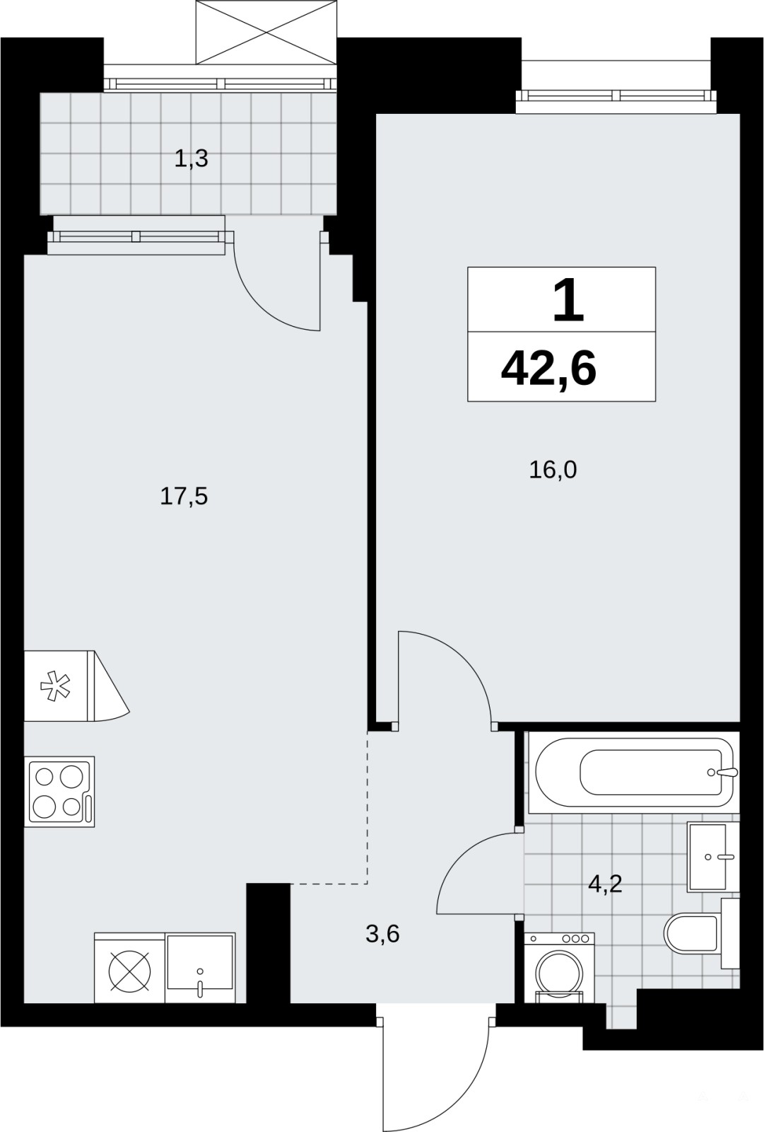 1-комн. квартира от застройщика с отделкой в ЖК "Прокшино" на 19 этаже. Общая площадь: 42.6 кв.м., жилая: 16 кв.м., площадь просторной кухни-столовой: 17.5 кв.м. Все окна выходят на одну сторону. В квартире одна лоджия, один совмещенный санузел. Высота потолков 2.95 м.