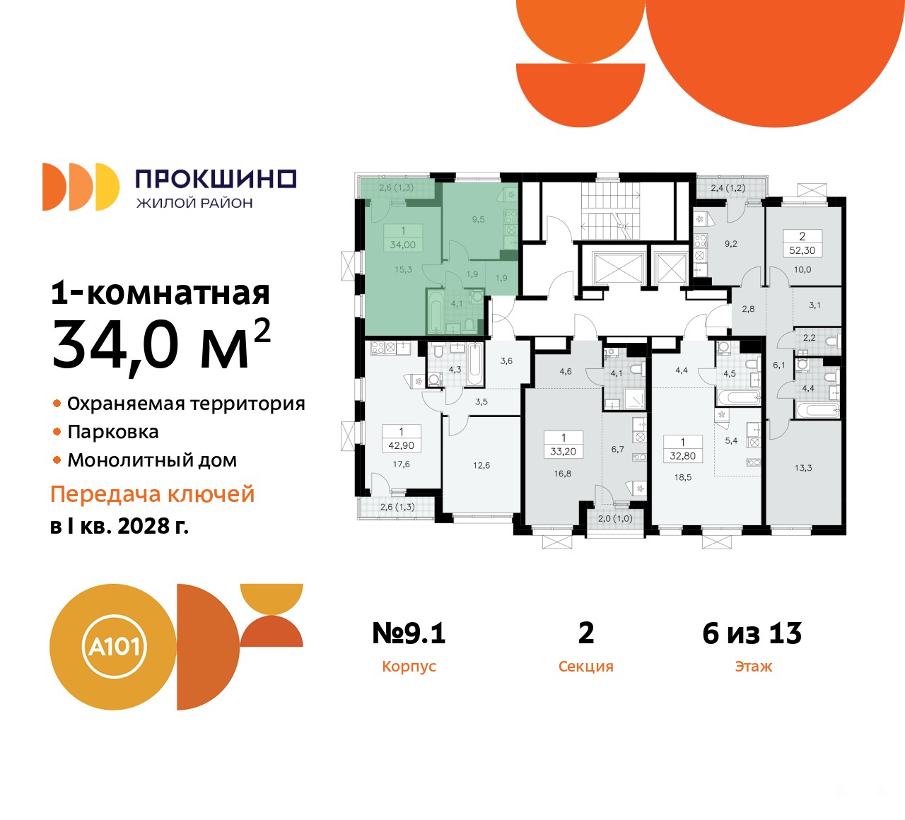 Дом монолитный, двухподъездный, высотой 13 этажей. Квартира находится во 2-й секции в корпусе 9.1. На этаже 5 квартир. В подъезде 1 пассажирский и 1 грузовой лифт. Начало строительства - 3 квартал 2025 года. Окончание строительства - 4 квартал 2027 года. Оформление сделки по договору долевого участия.