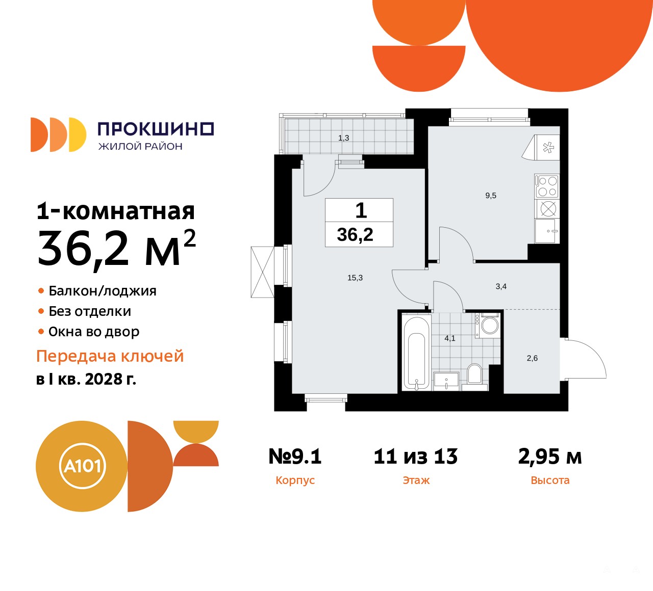 1-комн. квартира в ЖК "Прокшино" на 11 этаже. Квартира без отделки, новый владелец может сделать ремонт по индивидуальному проекту. Общая площадь: 36.2 кв.м., жилая: 15.3 кв.м., площадь просторной кухни-столовой: 9.5 кв.м. Квартира угловая, идеально подойдет любителям тишины и панорамных видов. В квартире одна лоджия, один совмещенный санузел. Высота потолков 2.95 м.