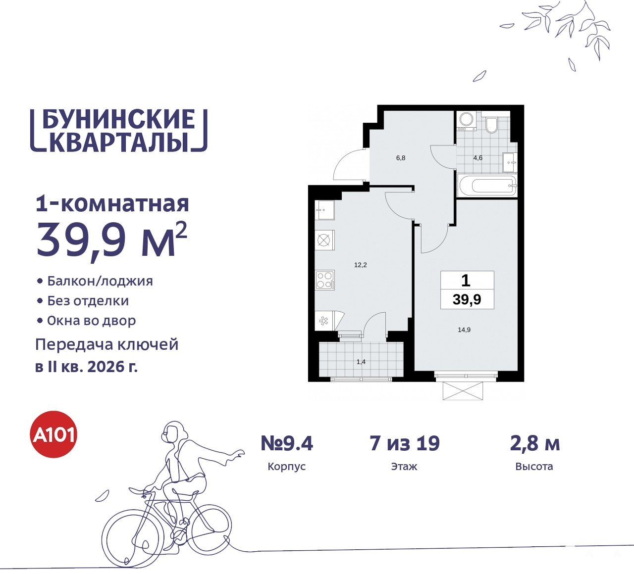 Однокомнатная квартира в ЖК "Бунинские кварталы" на 7 этаже. Квартира без отделки, после выдачи ключей можно делать ремонт. Общая площадь: 39.9 кв.м., жилая: 14.9 кв.м., площадь просторной кухни-столовой: 12.2 кв.м. Все окна выходят на одну сторону. В квартире одна лоджия, один совмещенный санузел. Высота потолков 2.8 м.