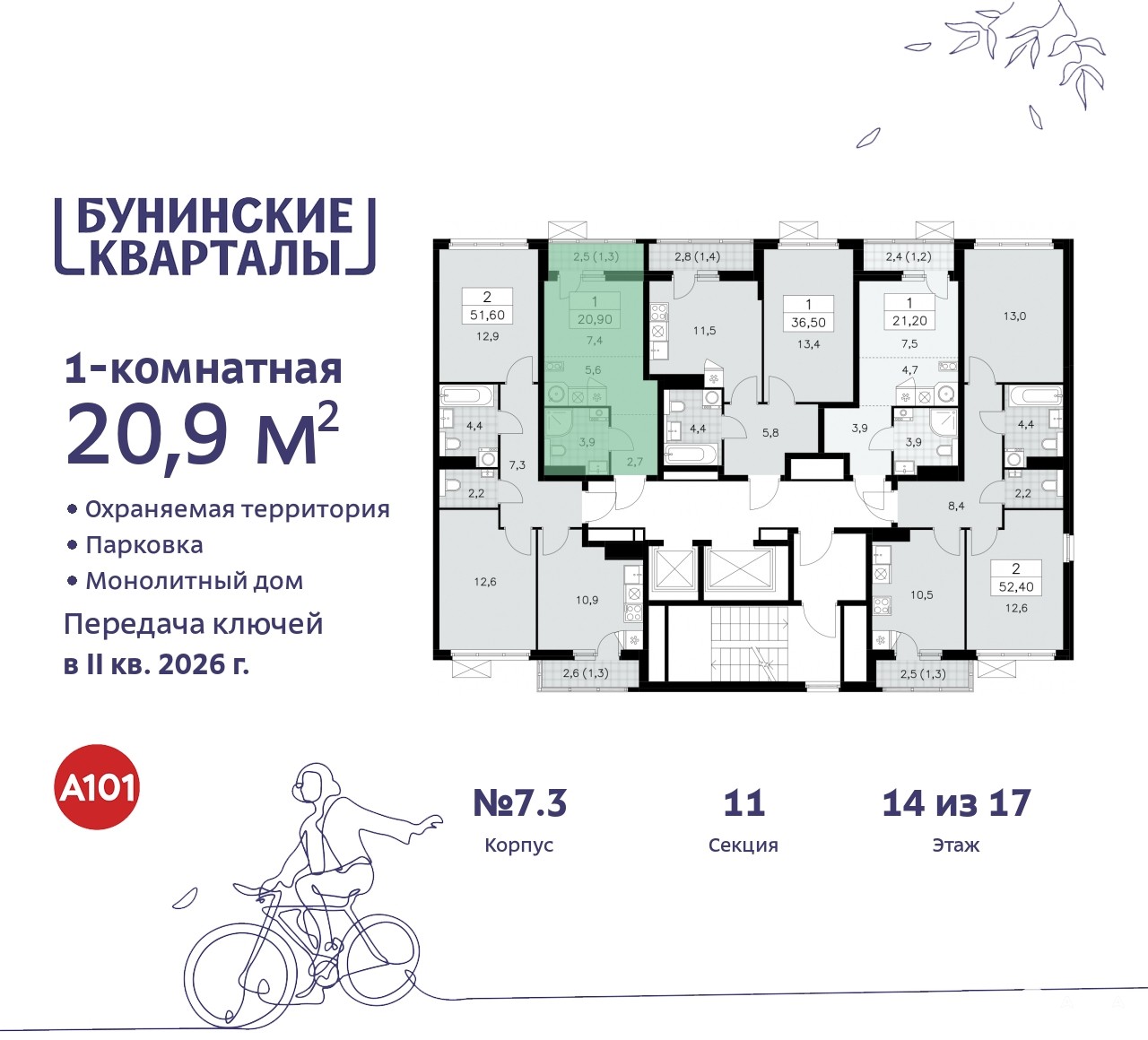 1-комн. квартира-студия в ЖК "Бунинские кварталы" на 14 этаже. Квартира без отделки, после выдачи ключей можно делать ремонт. Общая площадь: 20.9 кв.м., площадь гостиной 13 кв.м., из которых 5.6 кв.м. выделено под кухонную зону. Все окна выходят на одну сторону. В квартире один балкон, один совмещенный санузел. Высота потолков 2.8 м.