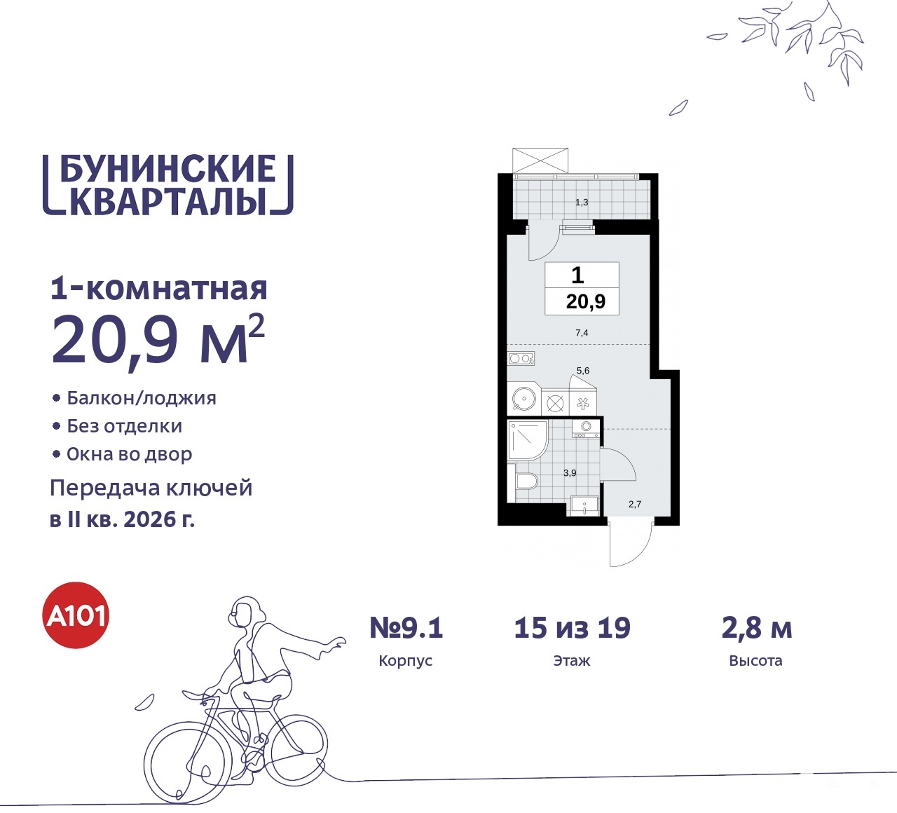 Просторная однокомнатная квартира-студия в ЖК "Бунинские кварталы" на 15 этаже. Квартира без отделки, после оформления собственности можно делать ремонт. Общая площадь: 20.9 кв.м., площадь гостиной 13 кв.м., из которых 5.6 кв.м. выделено под кухонную зону. Все окна выходят на одну сторону. В квартире один балкон, один совмещенный санузел. Высота потолков 2.8 м.
