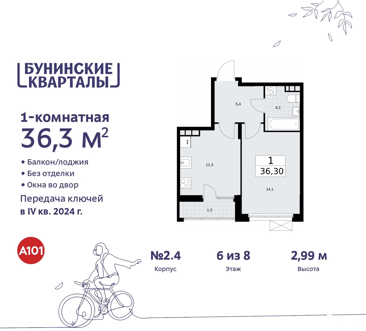 Однокомнатная квартира в ЖК "Бунинские кварталы" на 6 этаже. Квартира без отделки, после оформления собственности можно делать ремонт. Общая площадь: 36.5 кв.м., жилая: 14.1 кв.м., площадь просторной кухни-столовой: 11.4 кв.м. Все окна выходят на одну сторону. В квартире одна лоджия, один совмещенный санузел. Высота потолков 2.99 м.