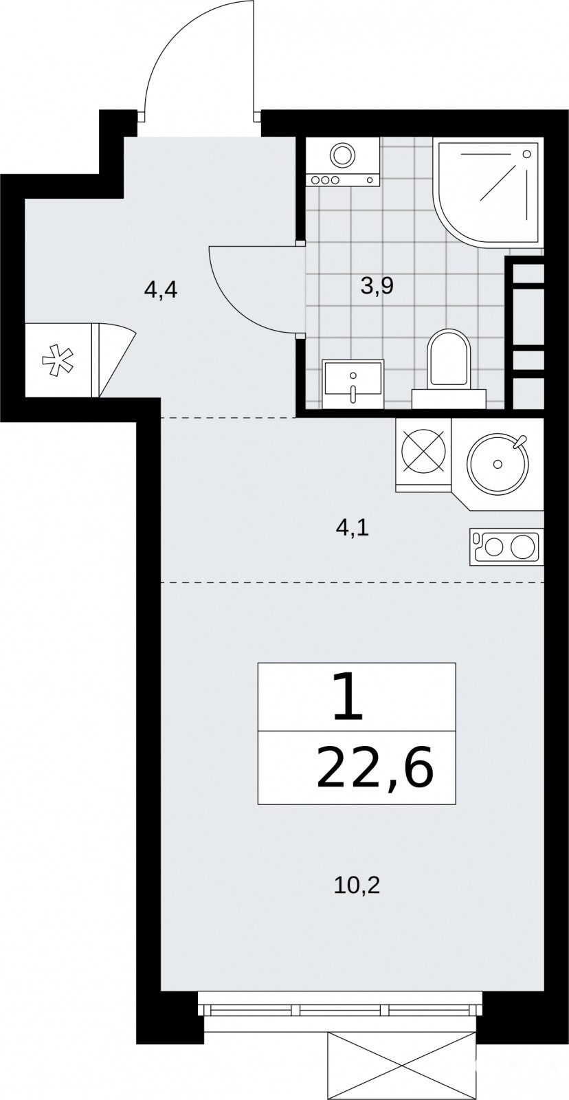 1-комн. квартира-студия в ЖК "Бунинские кварталы" на 4 этаже. Квартира без отделки, полностью готова к ремонту. Общая площадь: 22.6 кв.м., площадь гостиной 14.3 кв.м., из которых 4.1 кв.м. выделено под кухонную зону. Все окна выходят на одну сторону. В квартире один совмещенный санузел. Высота потолков 2.95 м.