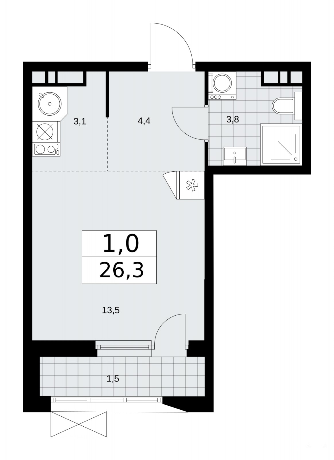 Однокомнатная квартира бизнес-класса-студия с предчистовой отделкой в ЖК "Бунинские кварталы" на 7 этаже. Общая площадь: 26.3 кв.м., площадь гостиной 16.6 кв.м., из которых 3.1 кв.м. выделено под кухонную зону. Все окна выходят на одну сторону. В квартире один балкон, один совмещенный санузел. Высота потолков 3.1 м.