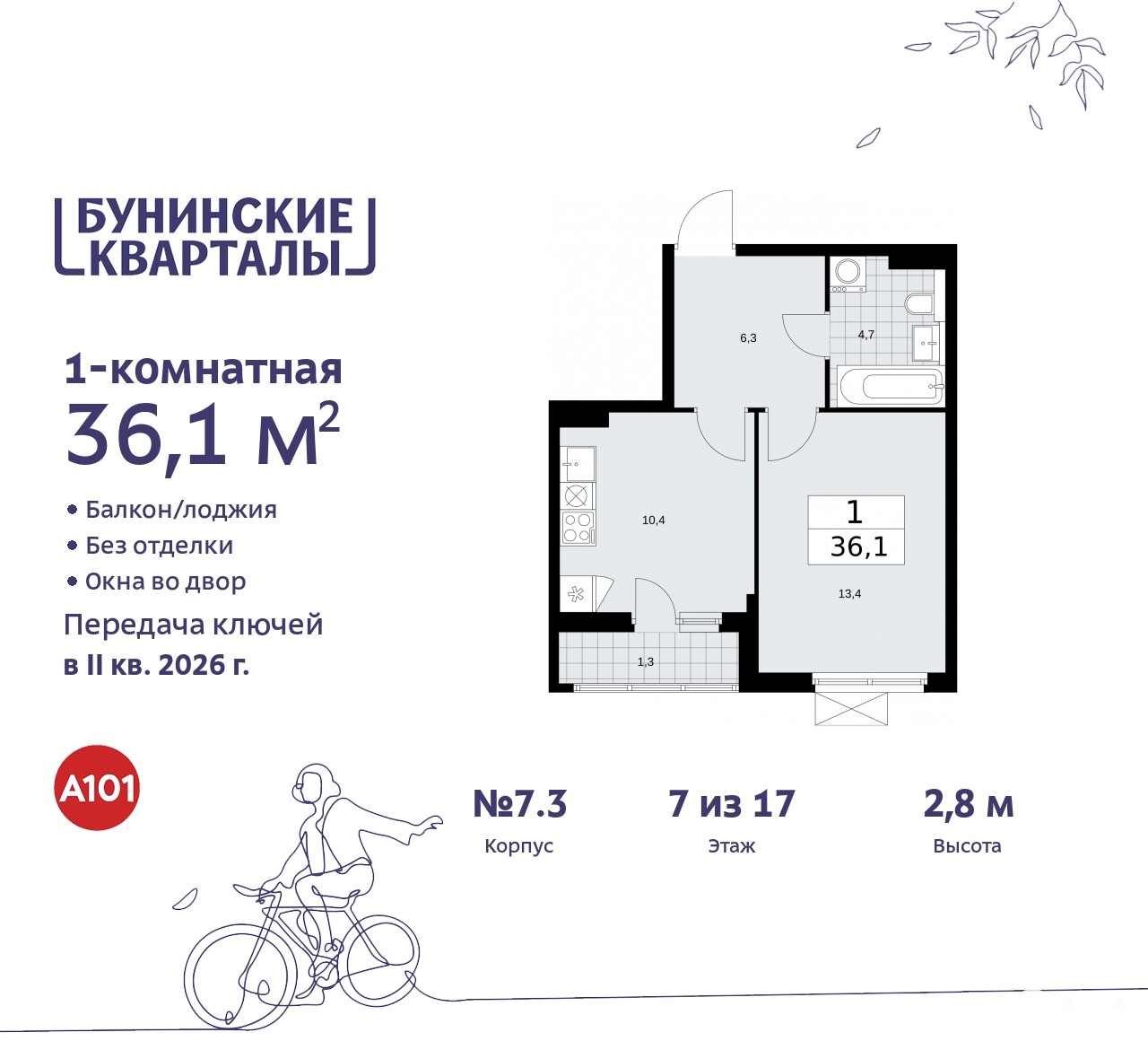 Просторная однокомнатная квартира в ЖК "Бунинские кварталы" на 7 этаже. Квартира без отделки, после оформления собственности можно делать ремонт. Общая площадь: 36.2 кв.м., жилая: 13.4 кв.м., площадь просторной кухни-столовой: 10.5 кв.м. Все окна выходят на одну сторону. В квартире одна лоджия, один совмещенный санузел. Высота потолков 2.8 м.