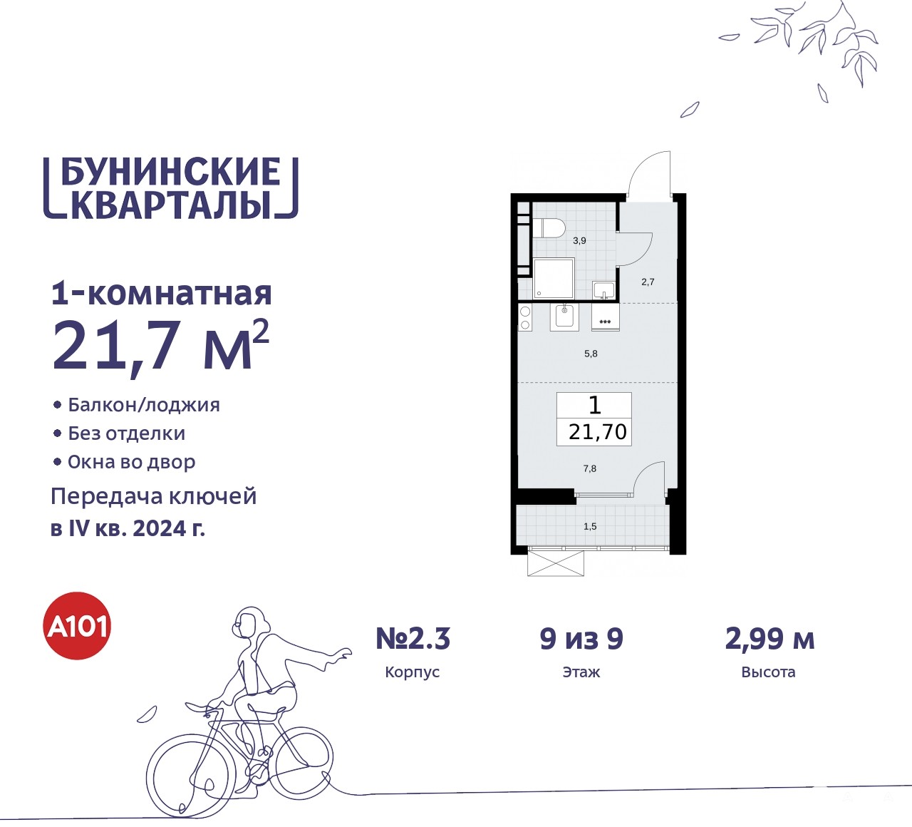 1-комн. квартира-студия от застройщика в ЖК "Бунинские кварталы" на 9 этаже. Квартира без отделки, новый владелец может сделать ремонт по индивидуальному проекту. Общая площадь: 21.5 кв.м. Высота потолков 2.99 м.