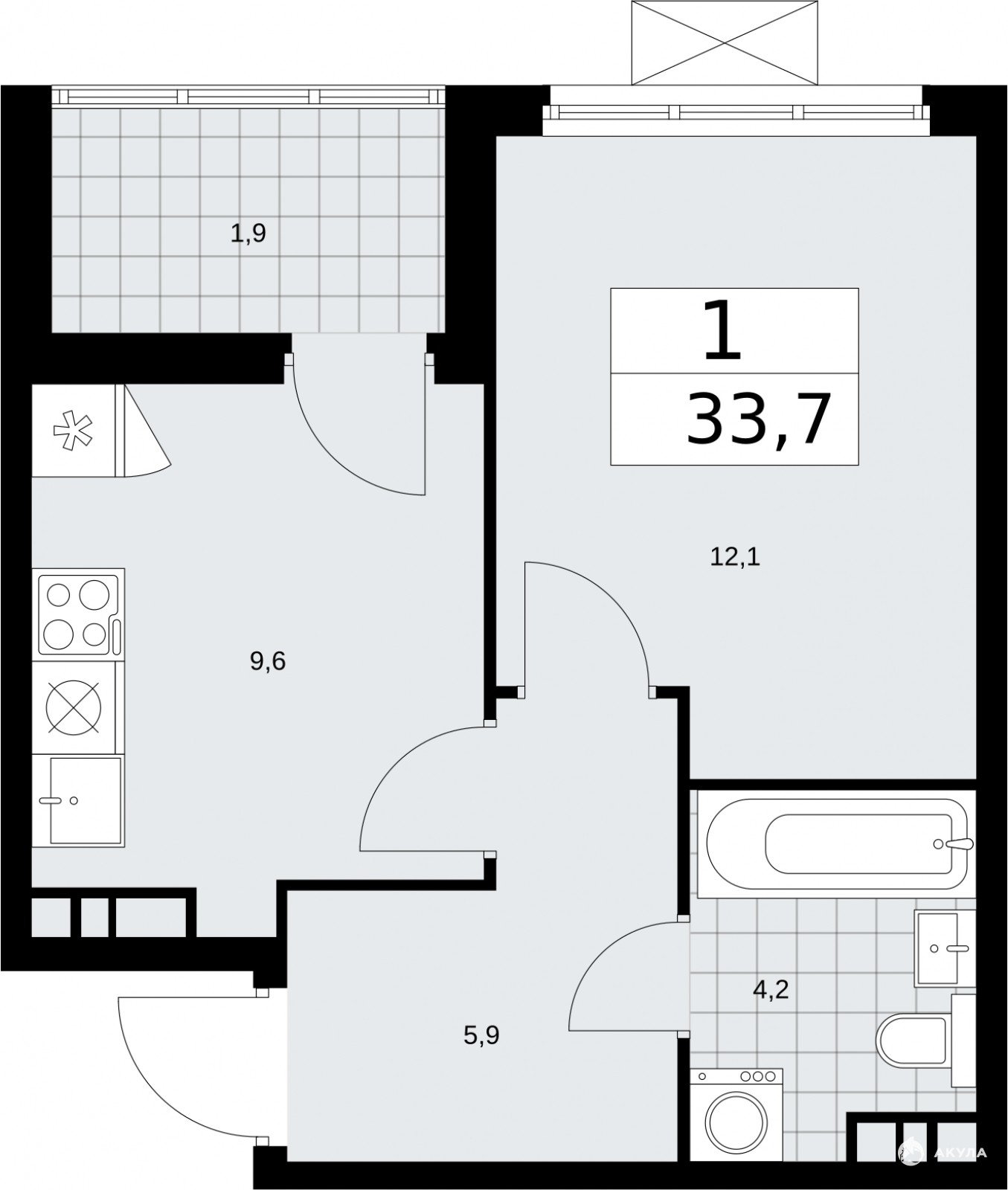 1-комн. квартира в ЖК "Бунинские кварталы" на 19 этаже. Квартира без отделки, после выдачи ключей можно делать ремонт. Общая площадь: 33.7 кв.м., жилая: 12.1 кв.м., площадь просторной кухни-столовой: 9.6 кв.м. Все окна выходят на одну сторону. В квартире одна лоджия, один совмещенный санузел. Высота потолков 2.85 м.