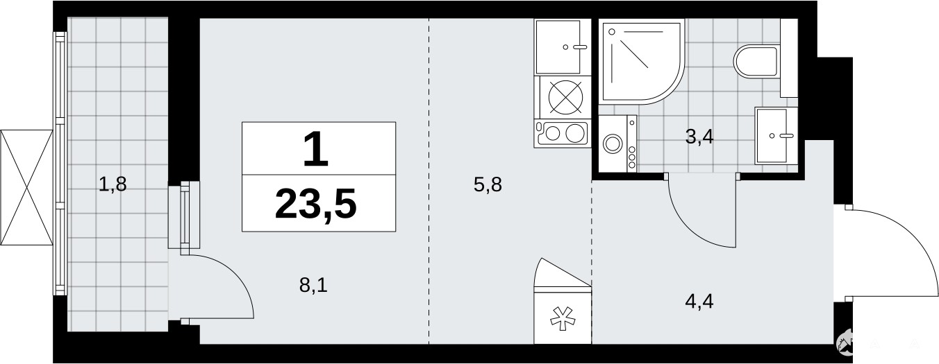 Просторная 1-комн. квартира-студия в ЖК "Бунинские кварталы" на 19 этаже. Квартира без отделки, после оформления собственности можно делать ремонт. Общая площадь: 23.5 кв.м., площадь гостиной 13.9 кв.м., из которых 5.8 кв.м. выделено под кухонную зону. Все окна выходят на одну сторону. В квартире один балкон, один совмещенный санузел. Высота потолков 2.8 м.