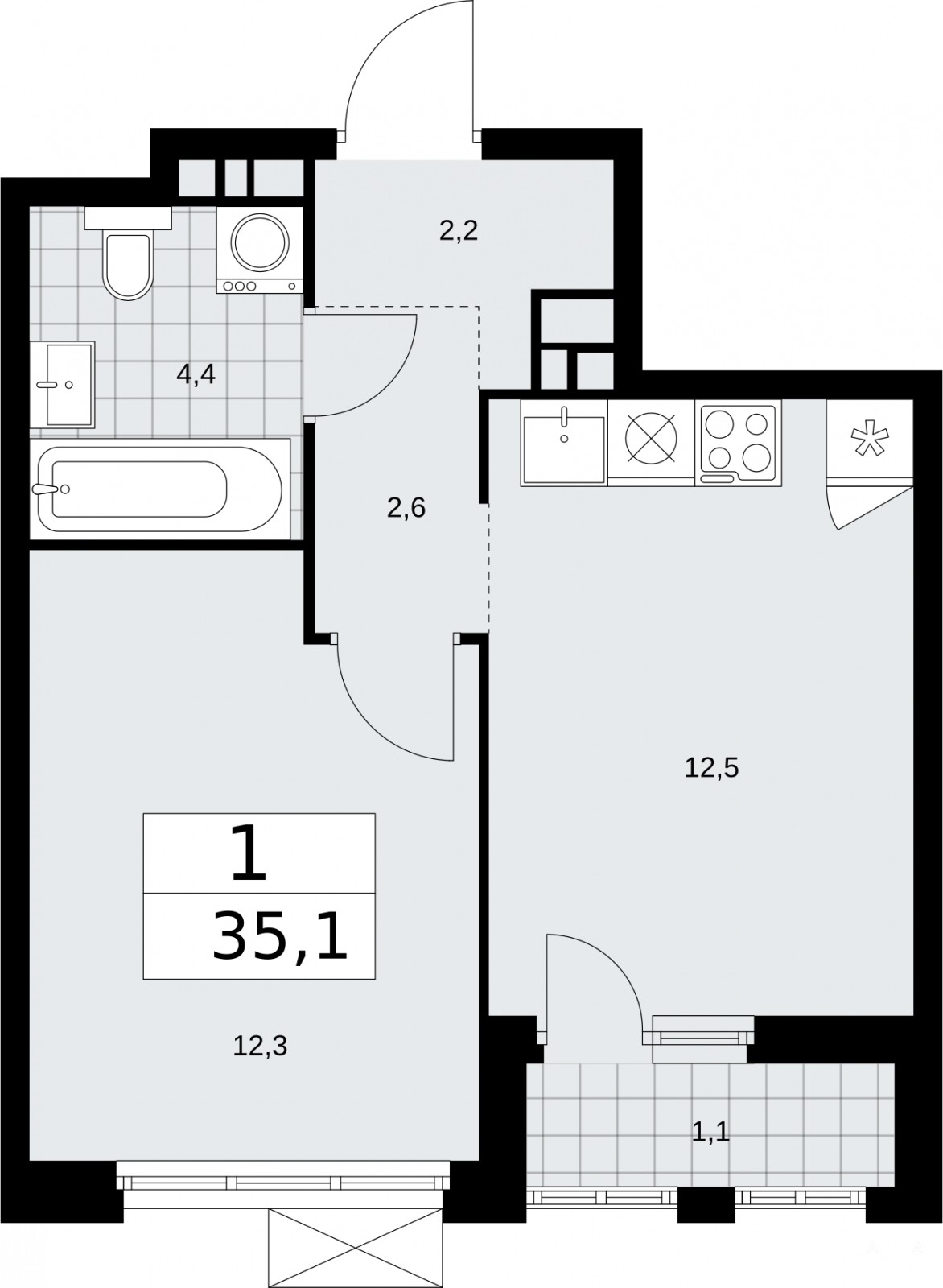 Однокомнатная квартира от застройщика с предчистовой отделкой в ЖК "Бунинские кварталы" на 9 этаже. Общая площадь: 35.1 кв.м., жилая: 12.3 кв.м., площадь просторной кухни-столовой: 12.5 кв.м. Все окна выходят на одну сторону. В квартире одна лоджия, один совмещенный санузел. Высота потолков 2.95 м.