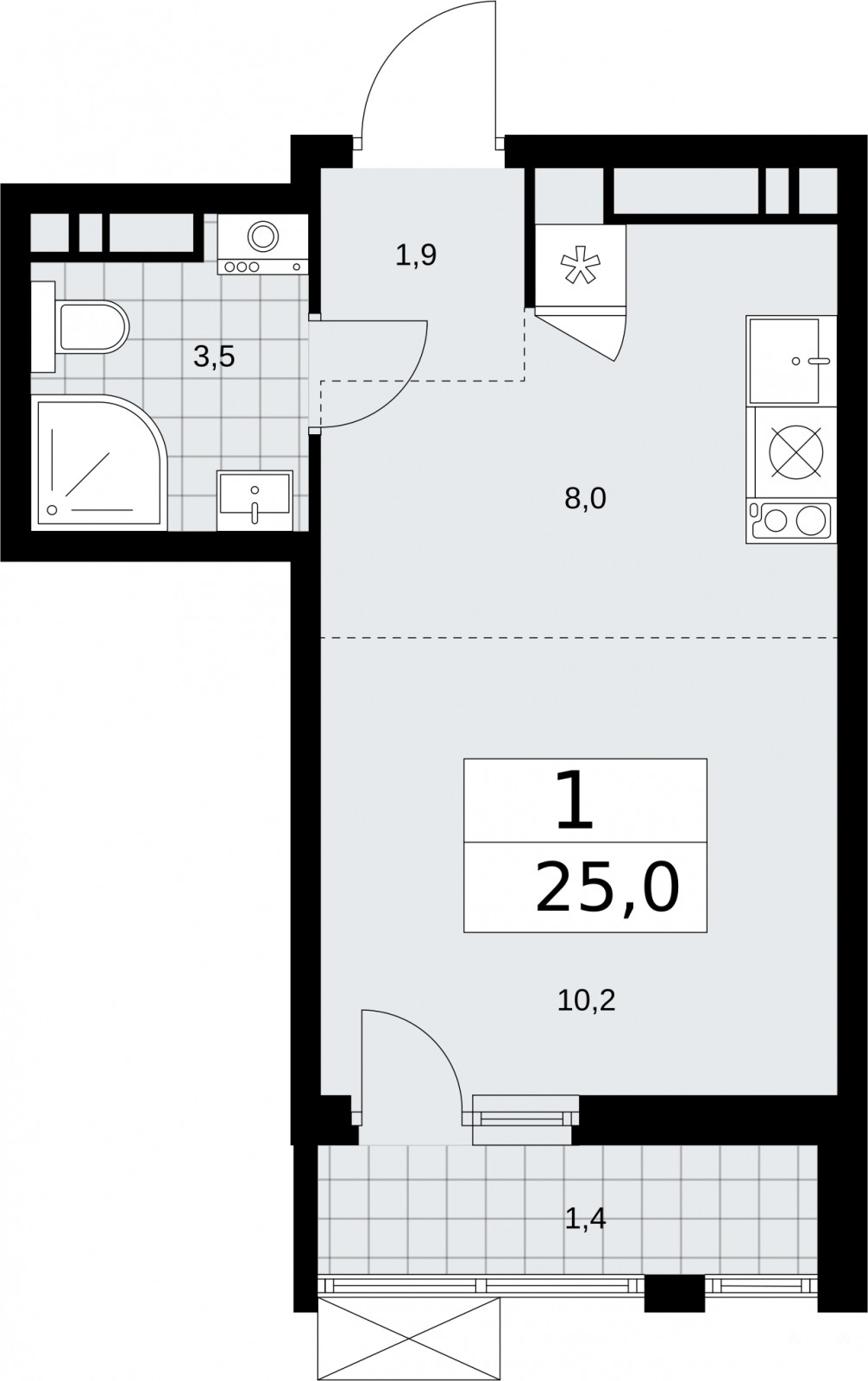 Продается 1-комн. квартира-студия с отделкой в ЖК "Бунинские кварталы" на 14 этаже. Общая площадь: 25 кв.м., площадь гостиной 18.2 кв.м., из которых 8 кв.м. выделено под кухонную зону. Все окна выходят на одну сторону. В квартире один балкон, один совмещенный санузел. Высота потолков 2.95 м.