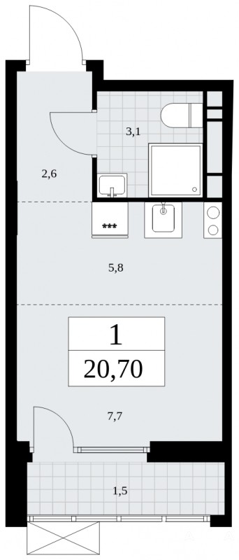 Продается однокомнатная квартира-студия в ЖК "Бунинские кварталы" на 9 этаже. Квартира без отделки, после выдачи ключей можно делать ремонт. Общая площадь: 20.7 кв.м., площадь гостиной 13.5 кв.м., из которых 5.8 кв.м. выделено под кухонную зону. Все окна выходят на одну сторону. В квартире один балкон, один совмещенный санузел. Высота потолков 2.99 м.